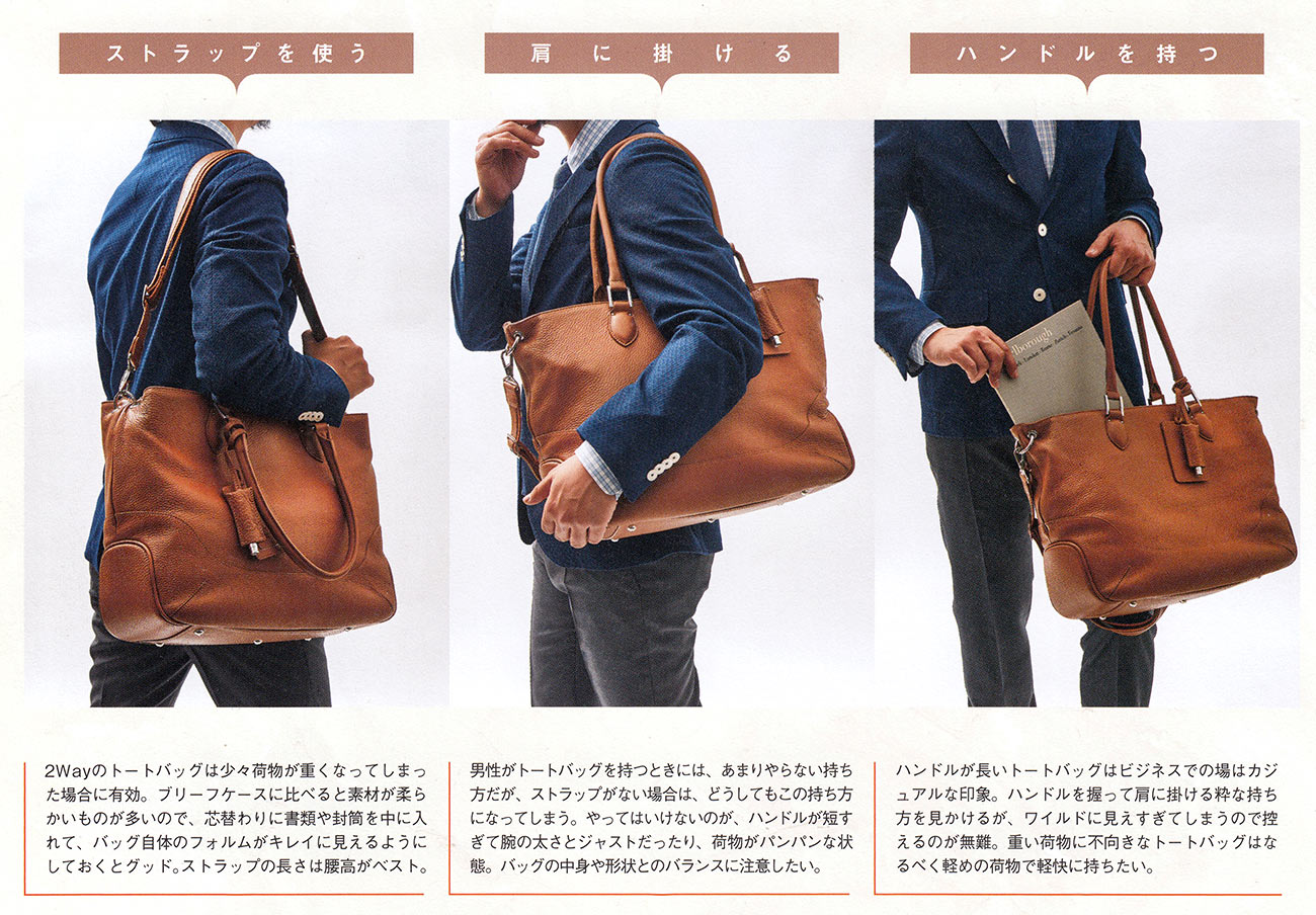 都会的な井出達でありショルダーとしても使える3way仕様のトート。