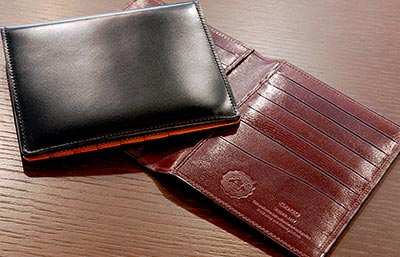 こちらはグロスグレインレザーにシグネチャーを型押しした名刺入れ。