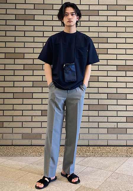上品な色「紺色」のTシャツと、相性抜群かつ少しビジネスライクなグレースラックスで、品のあるTシャツスタイルに。