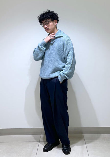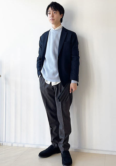 ニットはハイゲージだから上品感があります。春ということでニットの紺色~ブルーパンツの爽やかなグラデーション。