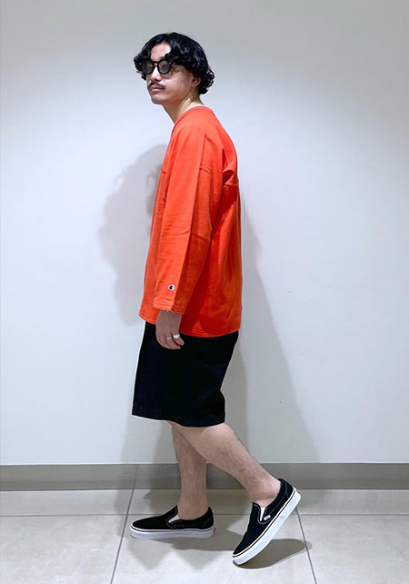 このくらいラフな着こなしには、夏向けのスリッポンがよく似合います。黒+黒でオレンジロンTを主役に。