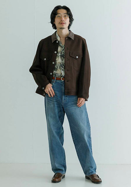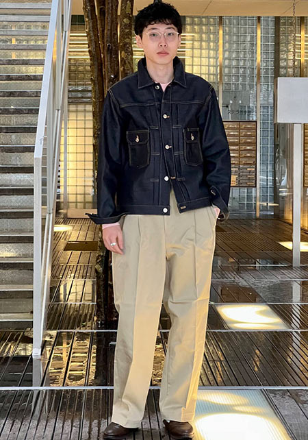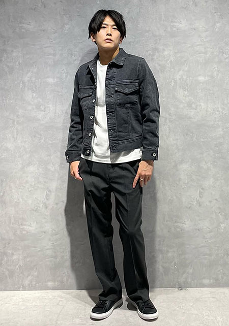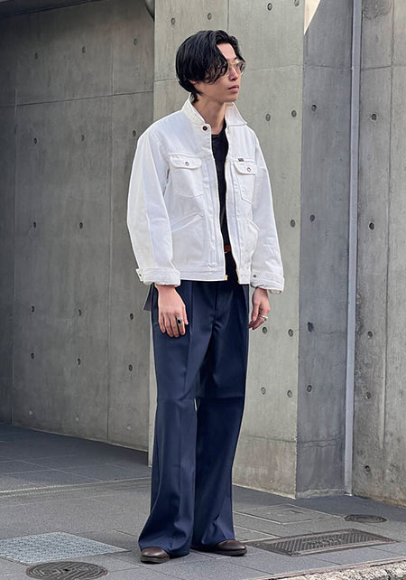 男らしいGジャンを、センタープレスの入ったパンツでキレイめにブラッシュアップ。
