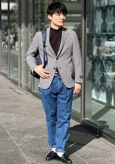 グレージャケットにデニムを合わせた王道ジャケパン。