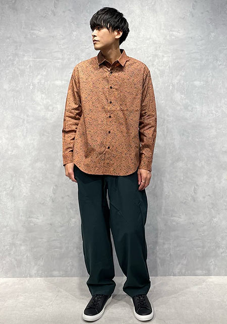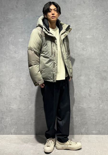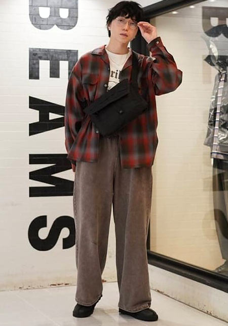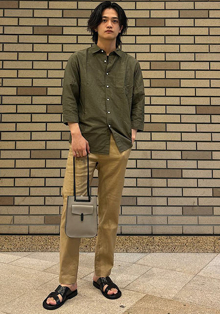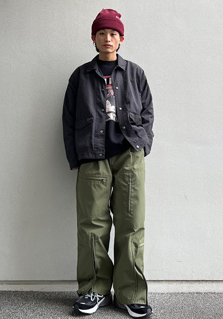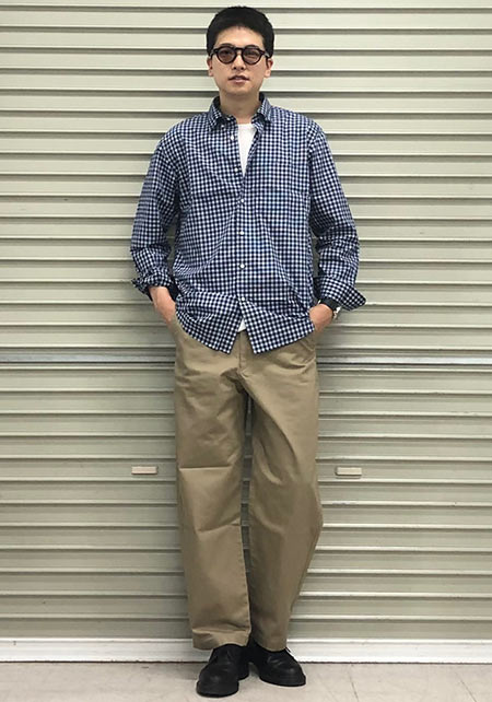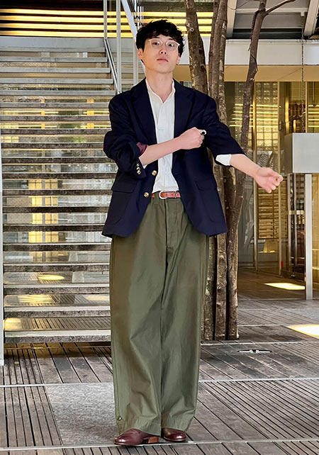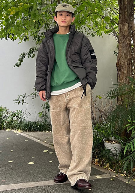 まさかの極太なカーキパンツですが、絶妙なIラインやサイジングで野暮ったさなし。袖まくり、相性の良いブラウンカラーをアクセントに入れているのもポイント。