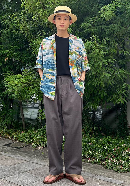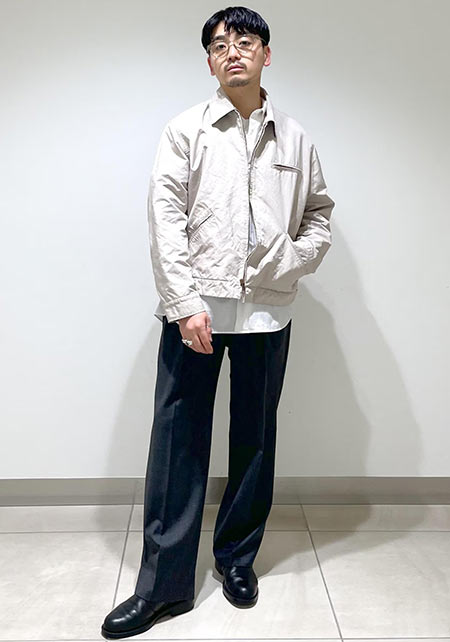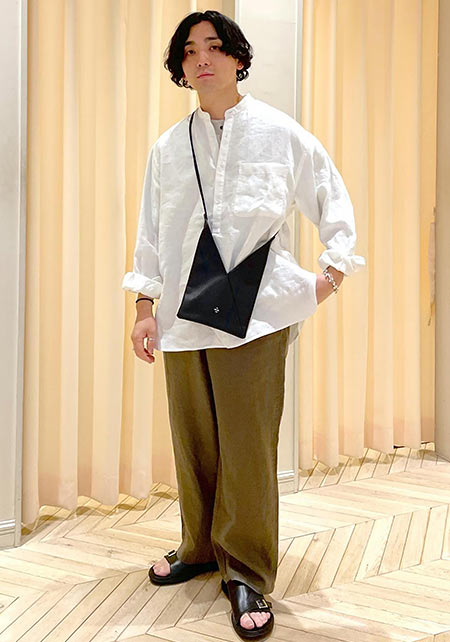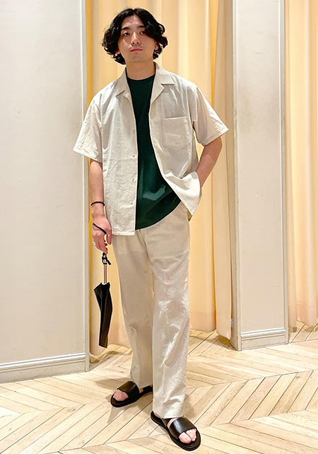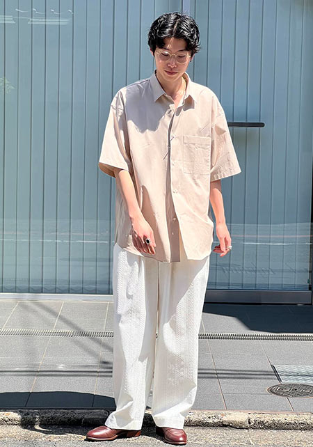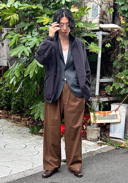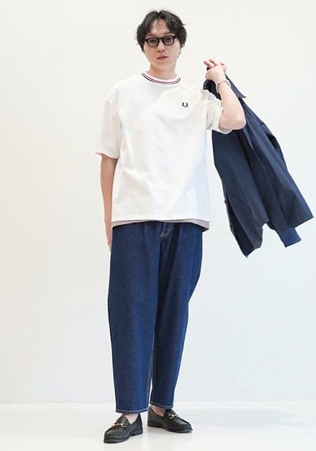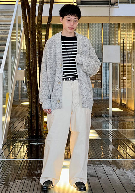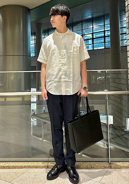 ともすれば学生っぽくなるアイテムですが、サマーウールを使用したワイドパンツ+ローファーで品はキープ。