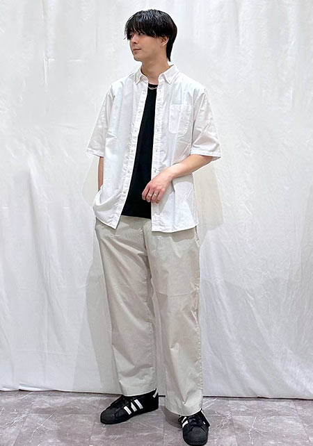 インナーの白Tと靴を色リンクさせているのがポイント。こちらは靴以外が全てユニクロです。