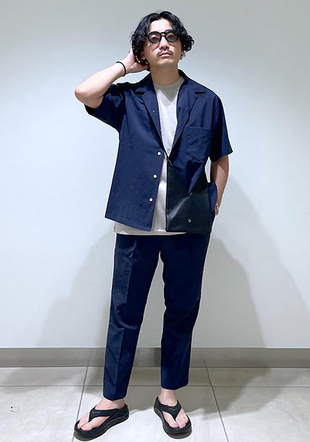 黒パンツはそのままに、ネイビーシャツを合わせてキレイめに。
