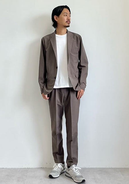 セットアップが黒色なので白Tと白スニーカーで重たくならないように調整。ちなみにセットアップには形態回復性とストレッチ性あり。