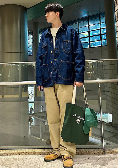 デニムはスーツスクエアのLee別注ですし、インナーのニット、足元のローファー、肩がけしたリュックも全てスーツスクエアなんです!