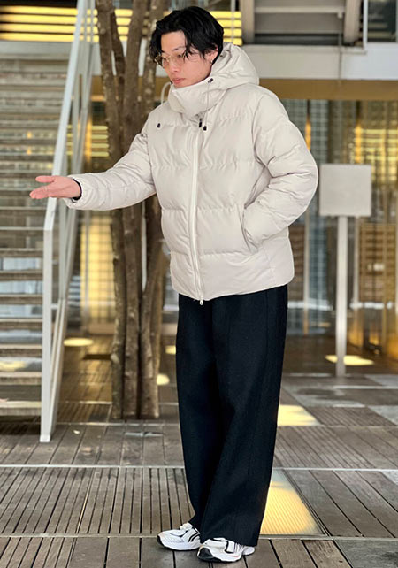 こちらも今っぽさを出すためにオーバーサイズ気味にしているのがポイントです。足元はボリュームスニーカーでダメ押し。