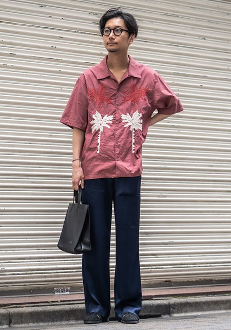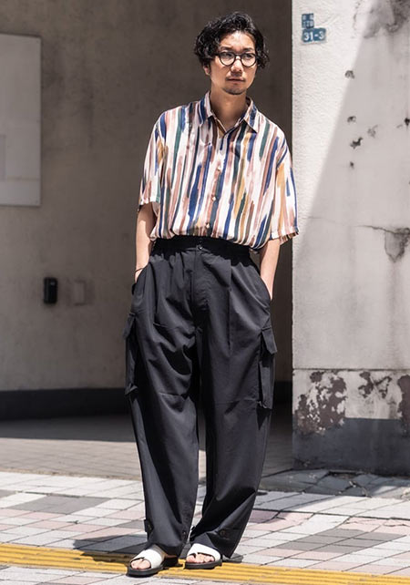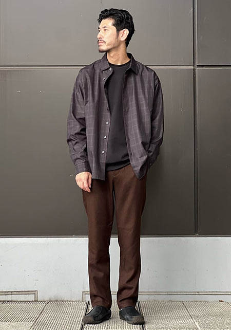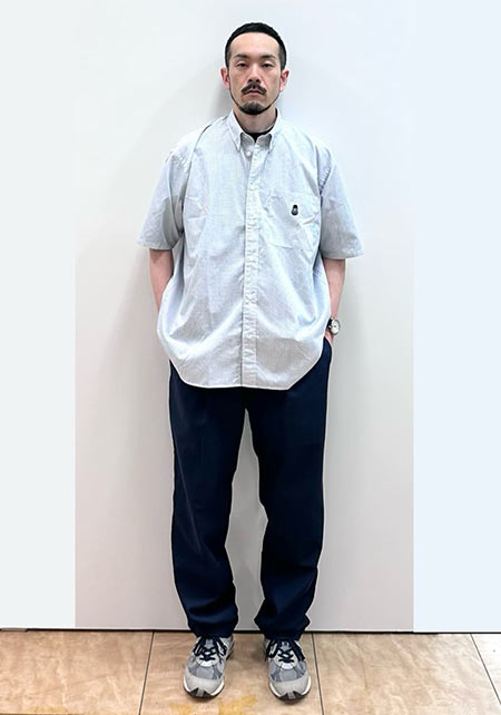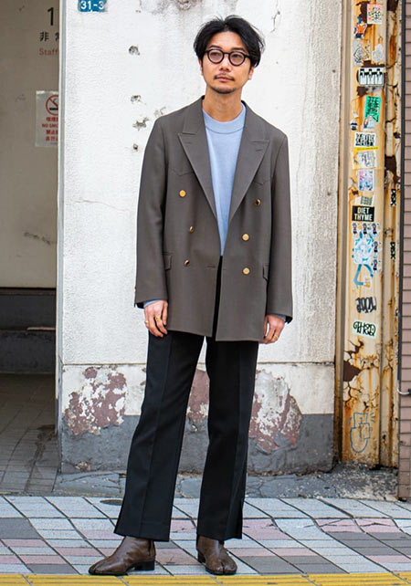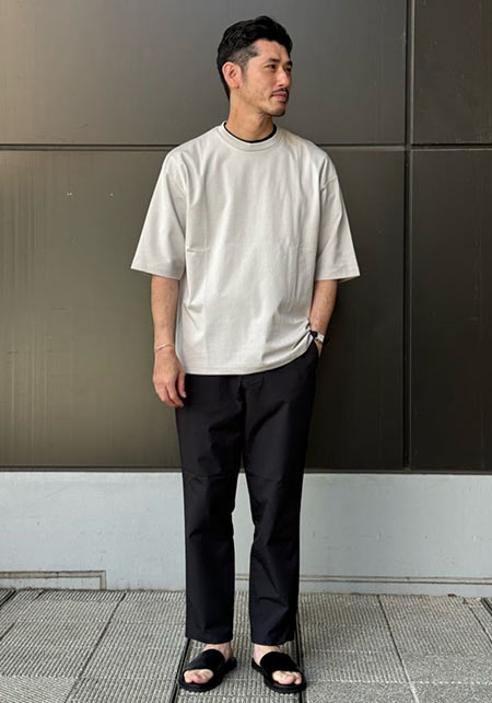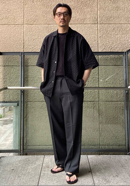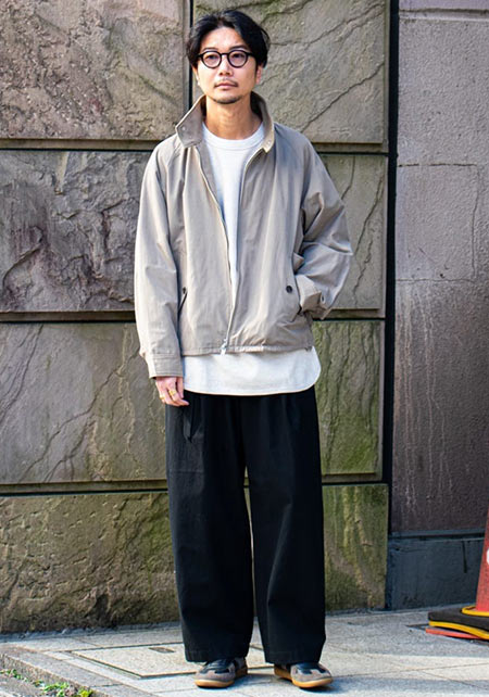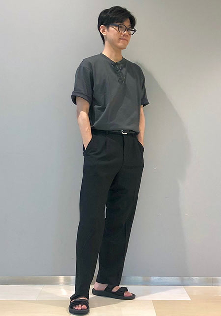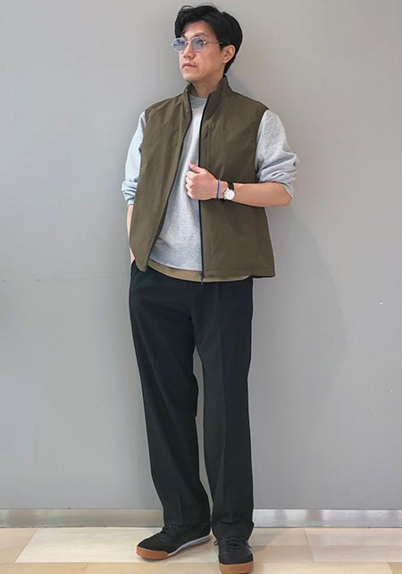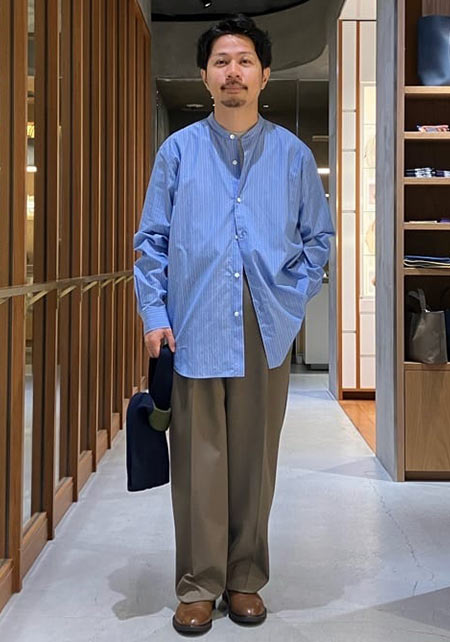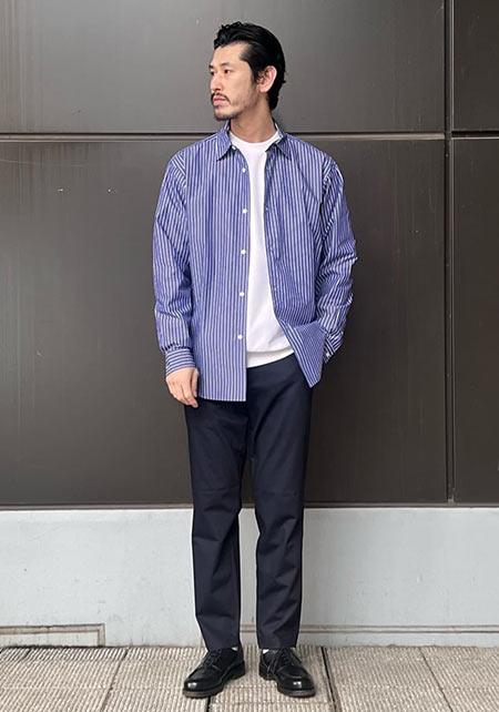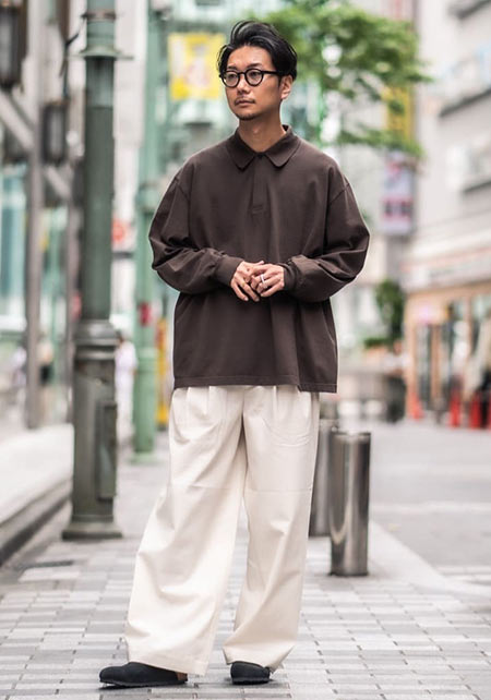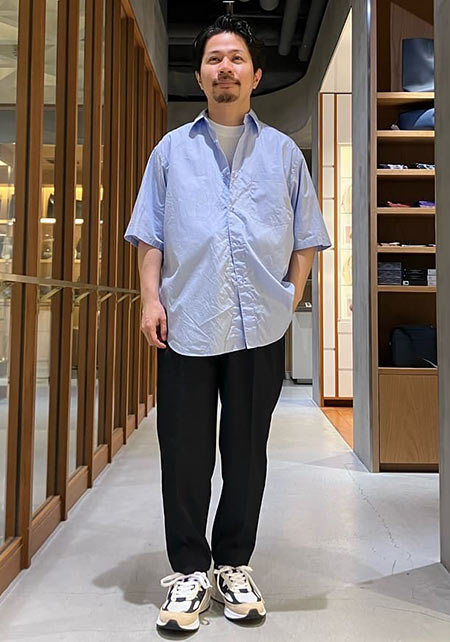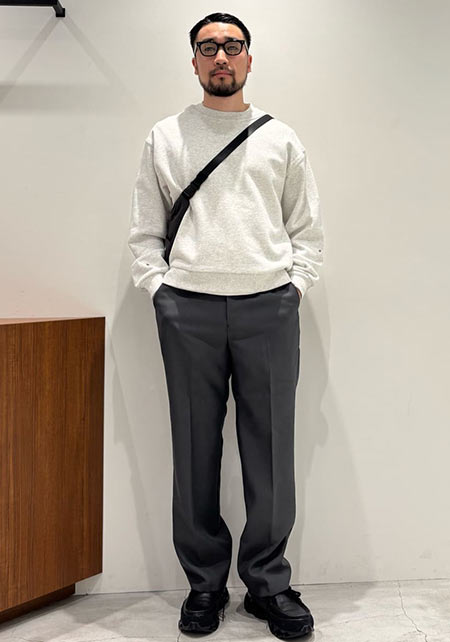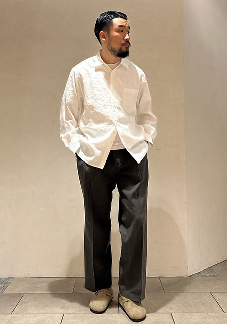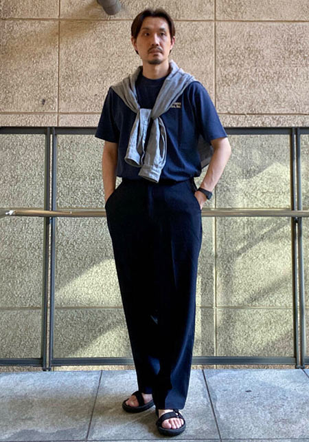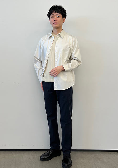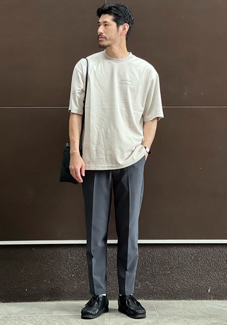 パンツは今流行っているワイドめのスラックス。こういう所でトレンド感を出して差をつけたいですね。