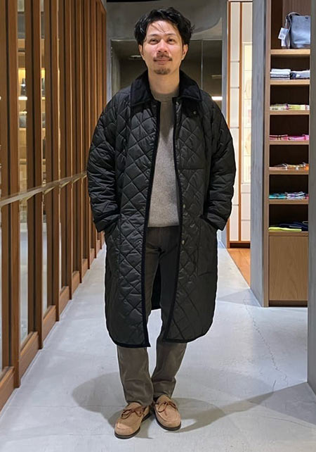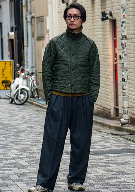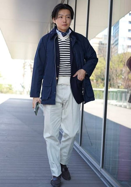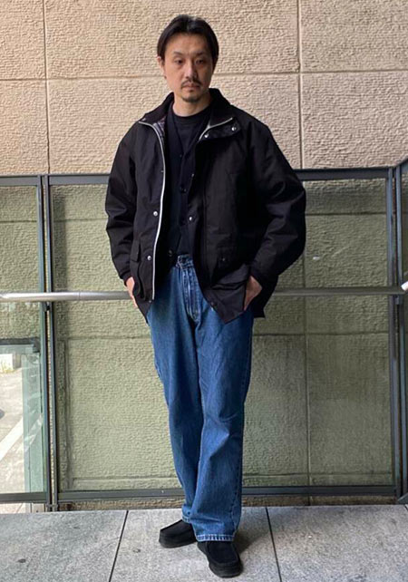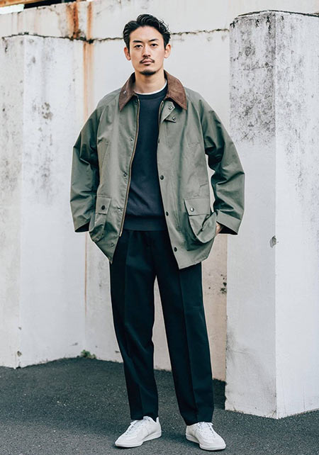 ジャーナルスタンダード別注のバブアー「BEADALE」を使った着こなし。最近はバブアーブームもあって、おしゃれなオヤジさんが着ているアウターでもあります。