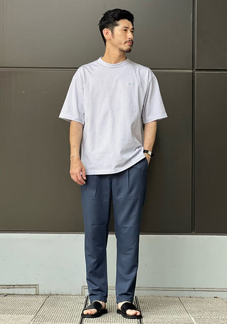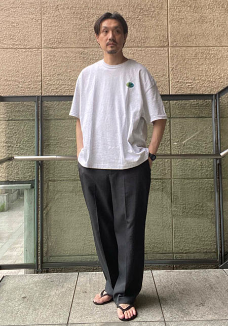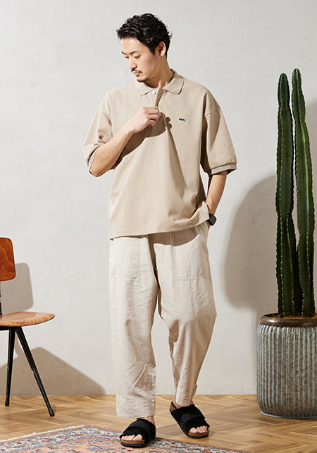 こちらはラコステの別注を使用。もちろん令和はオーバーサイズで着たい気分で、リネンのワイドパンツ+サンダルでリラックス感増し増し。