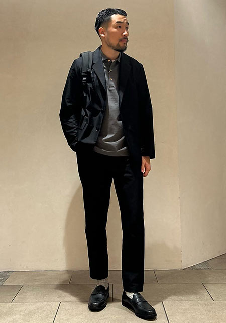 ポロシャツ+ローファーで、ドレスから少しカジュアルに寄せることでビジネスカジュアル向けに。