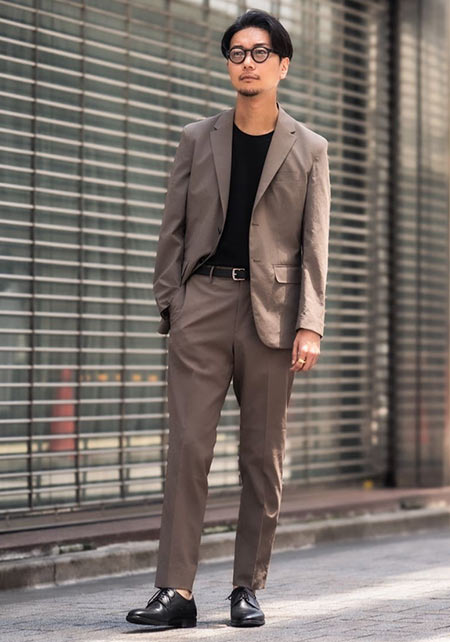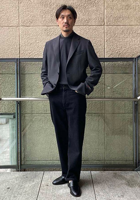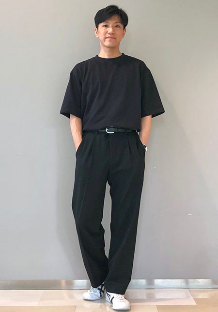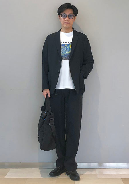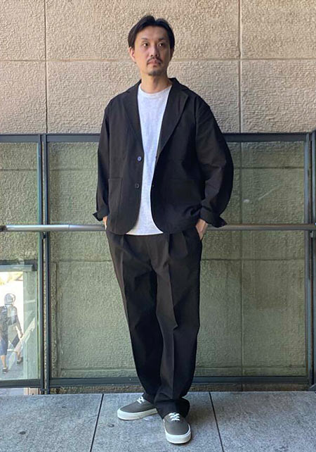 抑えておきたい基本の「黒セットアップ×白Tシャツ」。