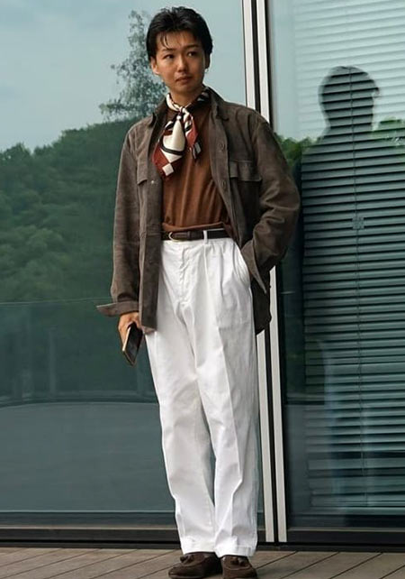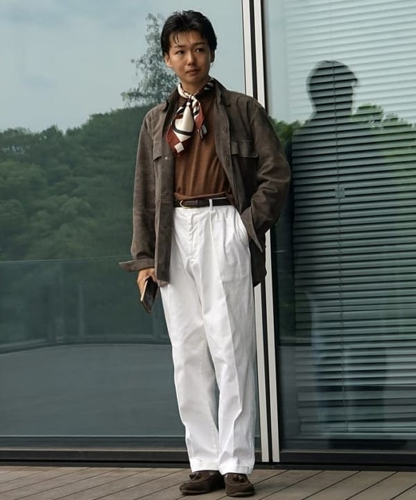 ブラウン×ブラウン(スニーカー)も洒脱に一役。秋向けですが、ブラウンの春色にすれば春にも対応できます。