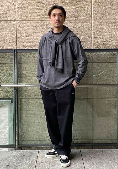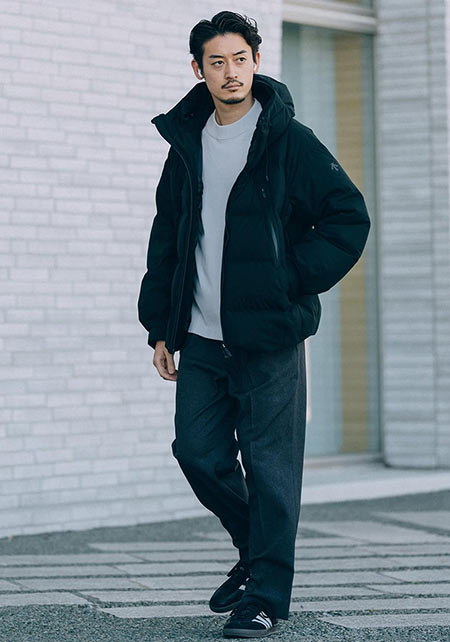 ブラック×グレーのモダンカラーに徹することで、大人が似合うカジュアルに。