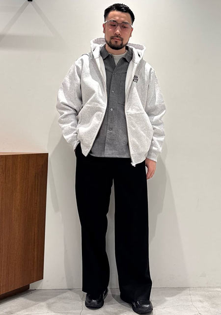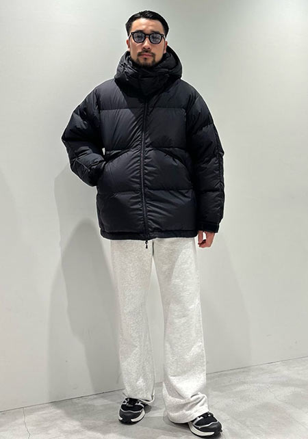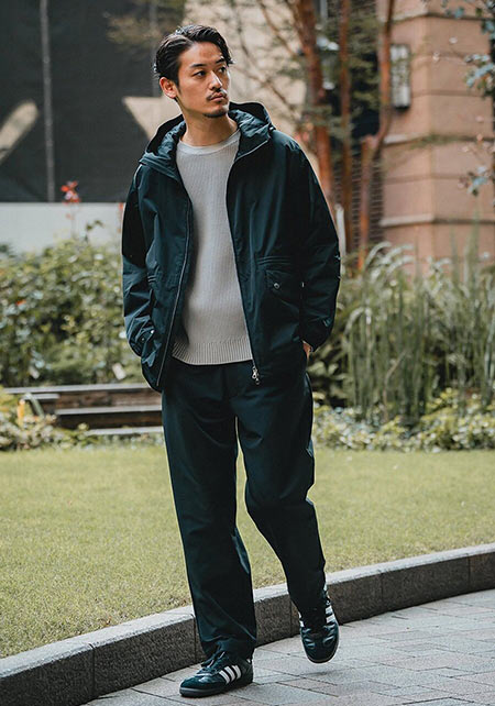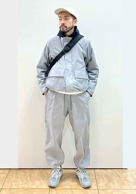 スポーティなシャカシャカ系のフーディコートを、モノトーンでまとめモダンに。