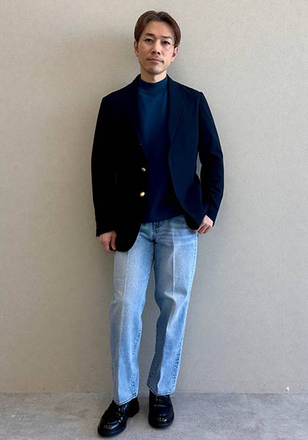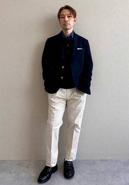 アメトラを思わせる「紺ブレザー×ベージュパンツ」の着こなし。