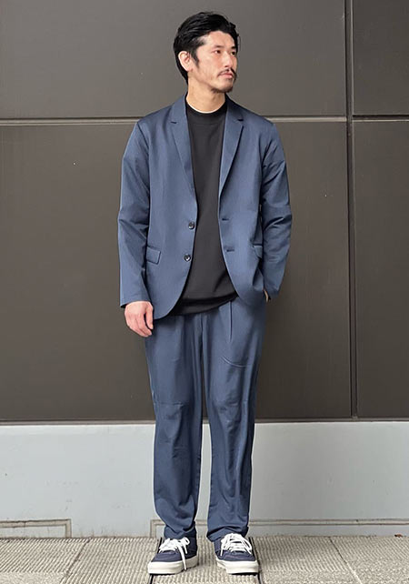 何かと重宝するセットアップ。少しユルリとしたシルエットで、今どき感、上品感の両方を兼ねそなえています。