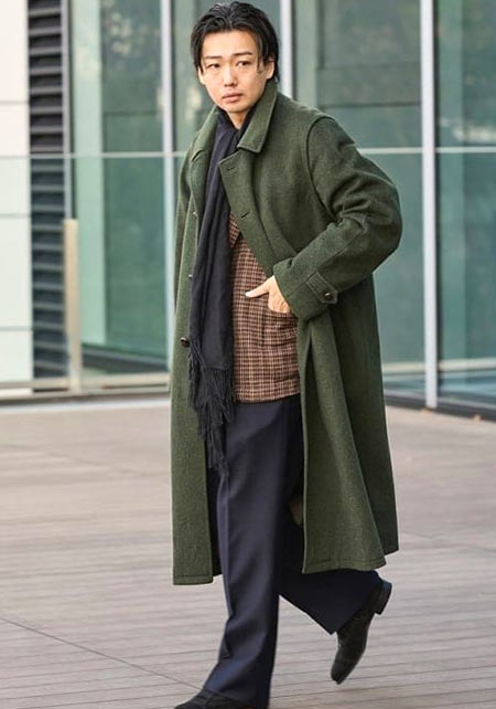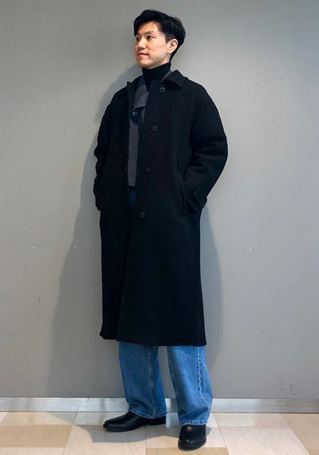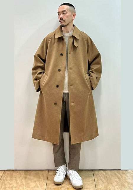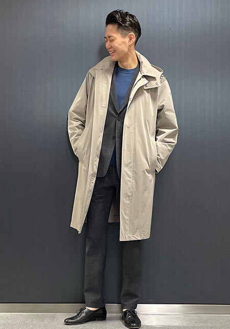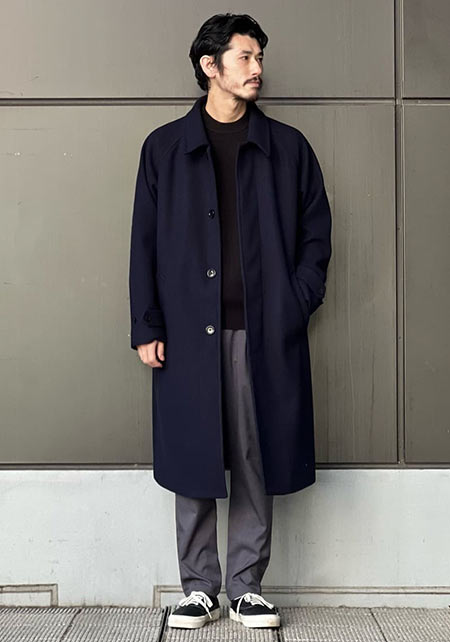 オン・オフ兼用できるステンカラーコート使ったクラシカルな着こなし。