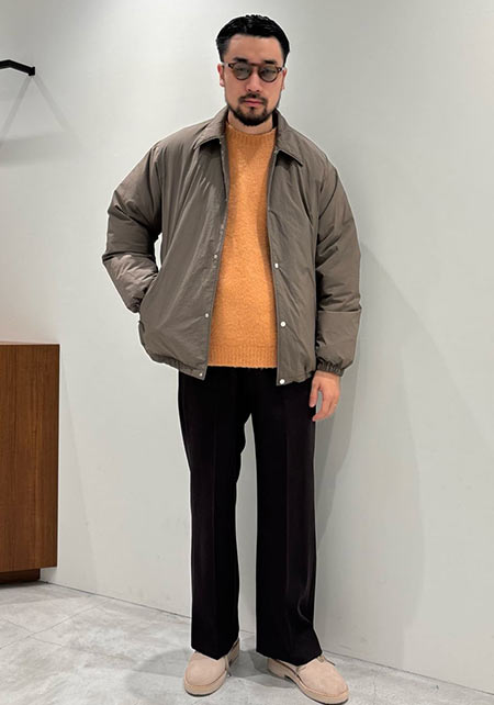 こちらもゆとりあるサイジングで旬な気分に。足元はカーキパンツを締める王道の黒を持ってきています。