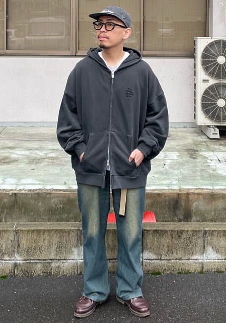 よくあるパーカーの着こなしは、ゆるいシルエット+今きているカーゴパンツでトレンド感を加味。