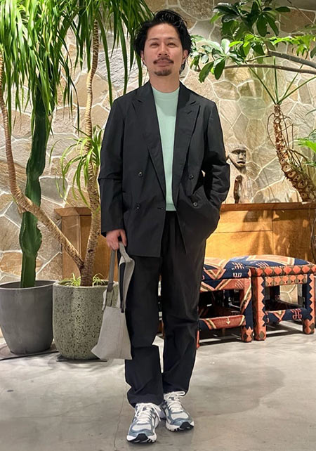 ダブルのセットアップを、プリントT+スニーカーという相反する要素でカジュアルダウン。