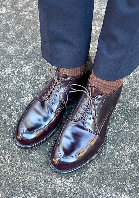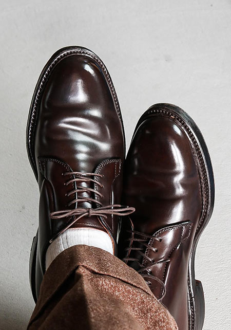 2つ目のポイントはシェルコードバン。世界屈指の名タンナーとして知られるホーウィン社製のコードバンは独特の鈍い艶を生むため革の宝石とも言われている。かつ履いて、磨くほどにその輝きを増していく独特のアジに魅了された人も少なくない。