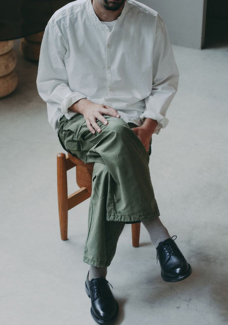 羽根やはき口のトップラインはホワイトレザーでトリミング。キャンバスと相性の良いホワイトラバーソールを採用。ジーンズ、チノ、スラックスなど様々なパンツと相性良し。