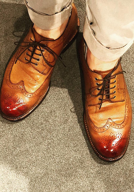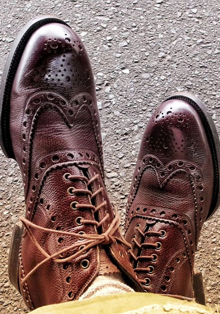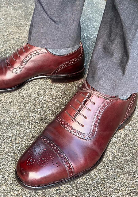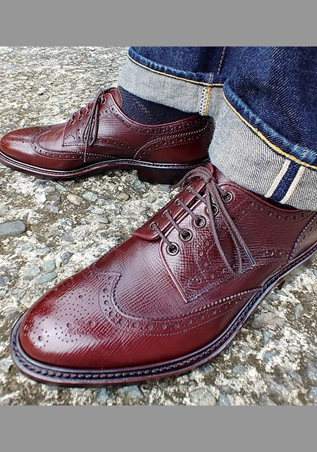 バーガンディレザーを用いた外羽根ウイングチップシューズは、華やかな穴飾りやアイレット(ハトメ)、ダブルソールなどで存在感をアピール。