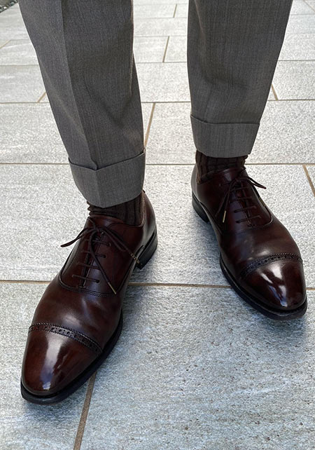 素材には光沢のあるハイシャインレザーのボルドー、靴底は雨の日でも気にせずはけるダイナイトソールの組み合わせ。9部仕立て。