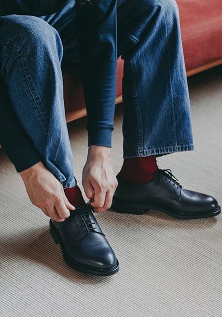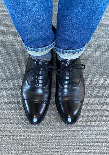フォーマルな外羽根プレーントゥのラストにデニムキャンバスをのせたニューモデル。