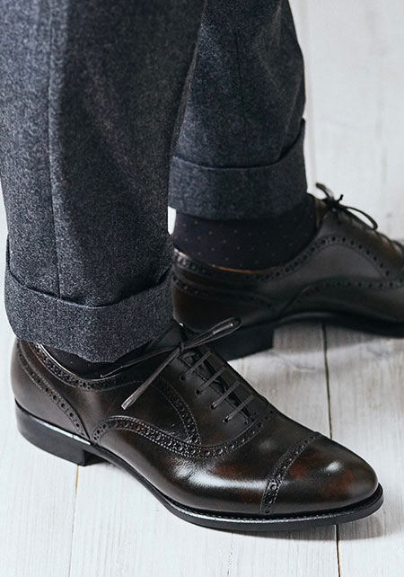 ウィングキャップの切り替えや穴飾りなど、細部まで職人の技が発揮された華やかな雰囲気。素材はダークブラウンのミスティーカーフ。グッドイヤーウェルト製法。