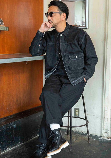 ヴィンテージ感を演出する素材のダメージ加工や、はき込んだ感を出す反り返ったトゥなど、細部まで手仕事の加工が施される。ブラックラピド製法。