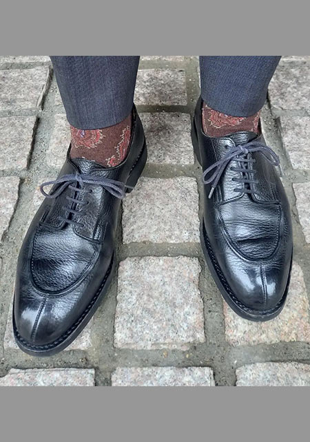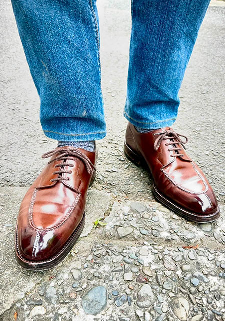 バーガンディカラーのコードバンを用いたキップトゥシューズ。木型はゆったりとしたフォルムながら高いフィット感をもたらす「モディファイド」ラスト。