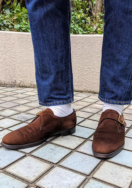 きめ細かく上質なイタリア製カーフスエードと、日本人の足型に合わせて”かかと”のホールドが非常に良いのが特長。ハンドソーン・ウェルテッド製法。