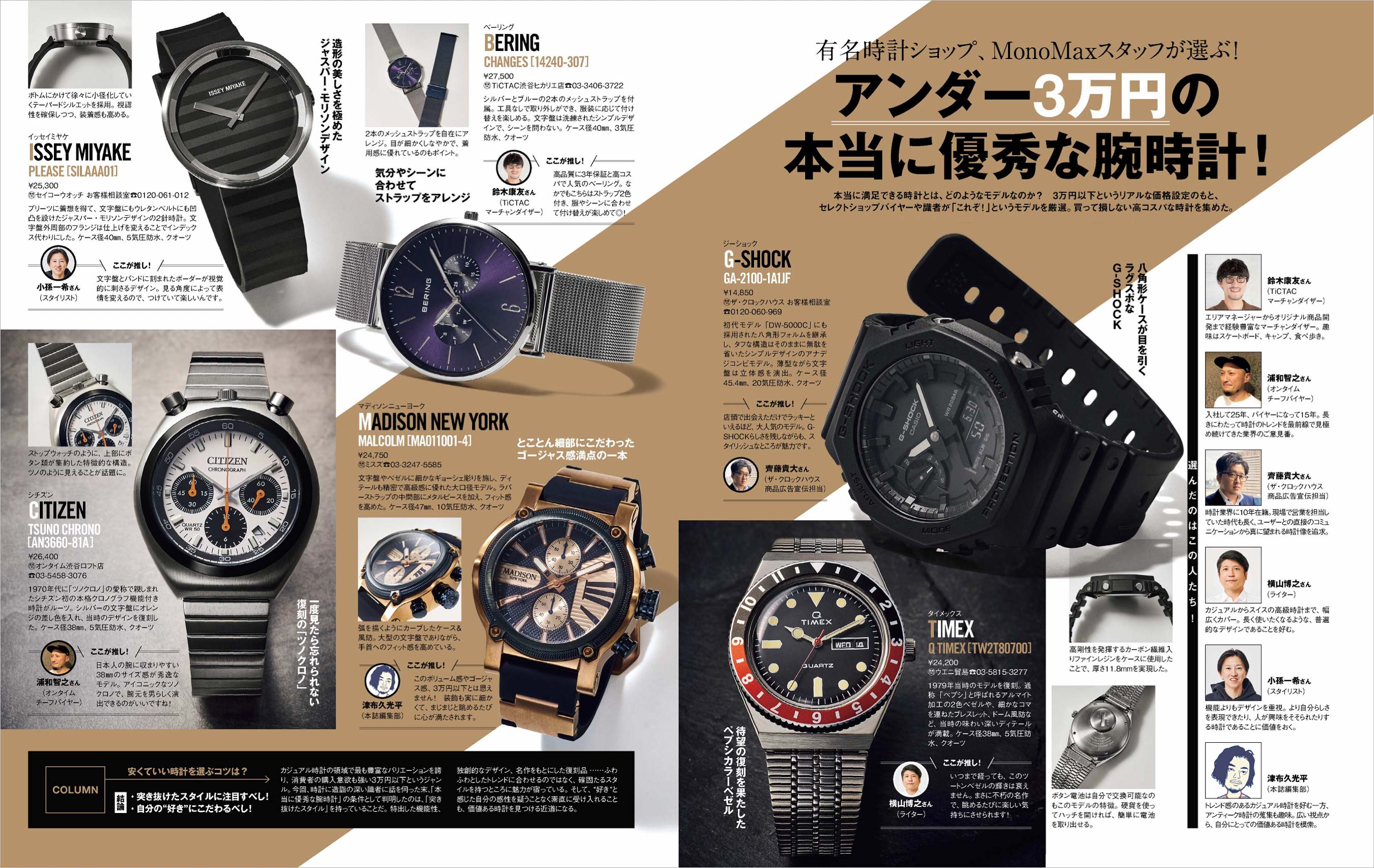 今回は『3万円以下の腕時計ブランドランキング80選〈種類別〉』をはじめ、名門ブランドのエントリーモデル、カジュアルウォッチの定番モデル、新鋭ブランドの話題モデルなどなど名作モデルも一挙に紹介!