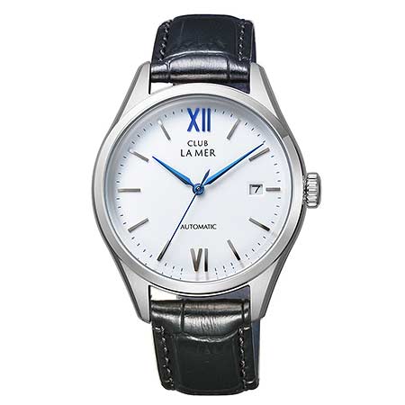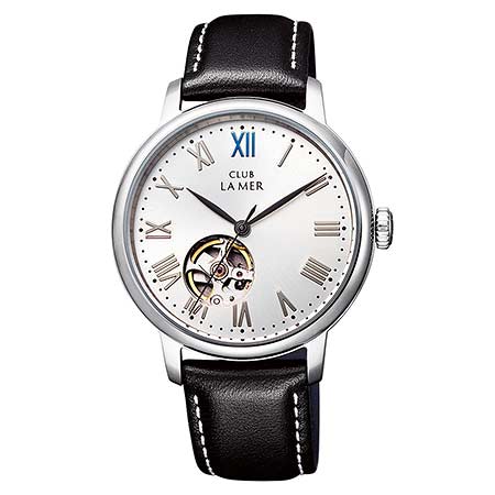 自動巻き機能に手巻き機能と秒針停止機能が加わったスタンダードシリーズの3針モデル。文字盤上の9時位置にあるオープンハートからテンプの動きが眺められる。鮮やかなブルーのダイヤルにシルバーの心臓部が好印象。ストラップはカーフレザー。最大駆動時間約40時間。