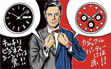 普遍的なダイバーズ×クロノグラフモデル。高級感が漂うブラックを基調に、メリハリがあるツートンカラーは都会的な印象。オフィスカジュアルでもタウンユースでも、オンオフ問わずに着用できる。