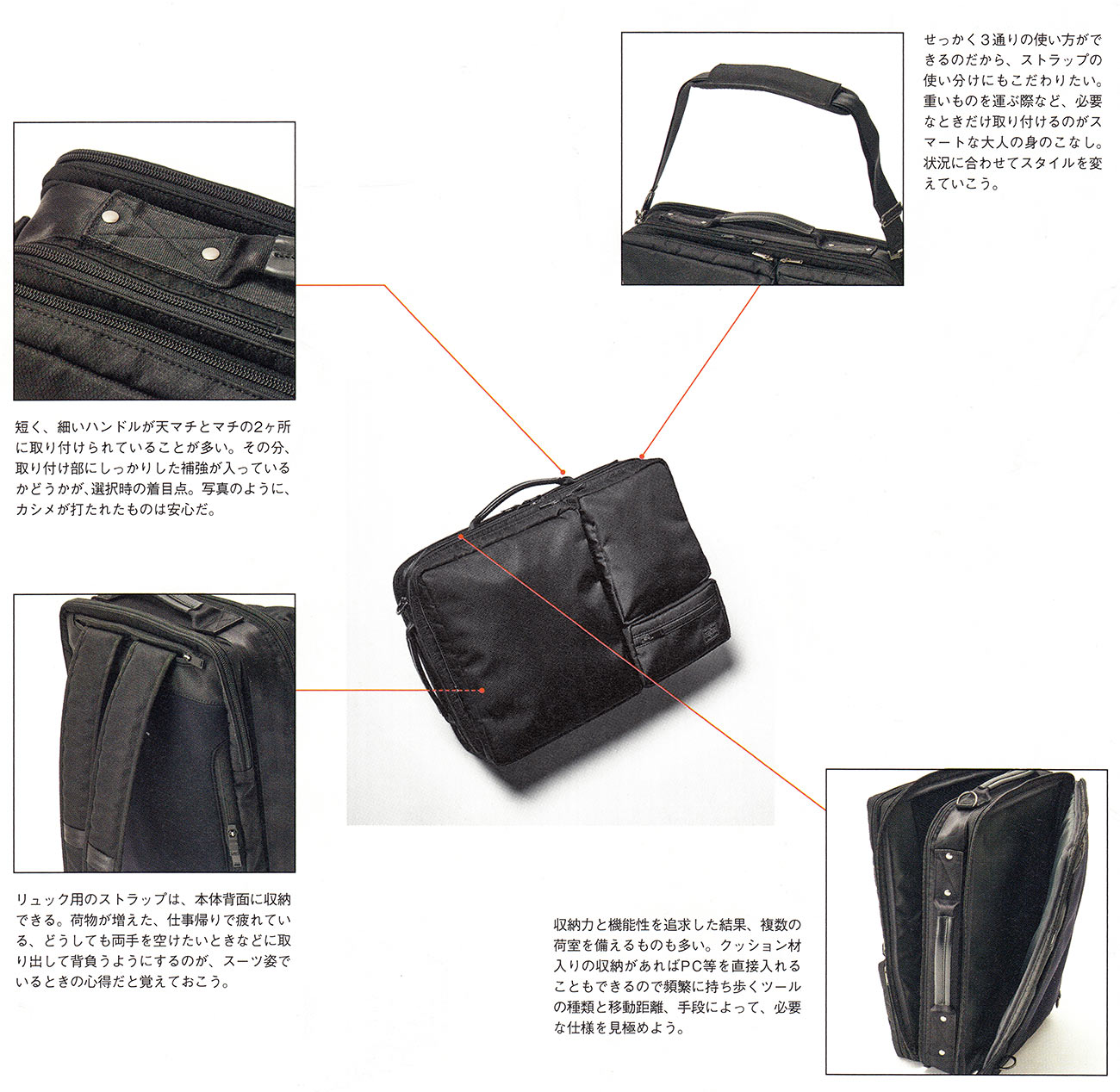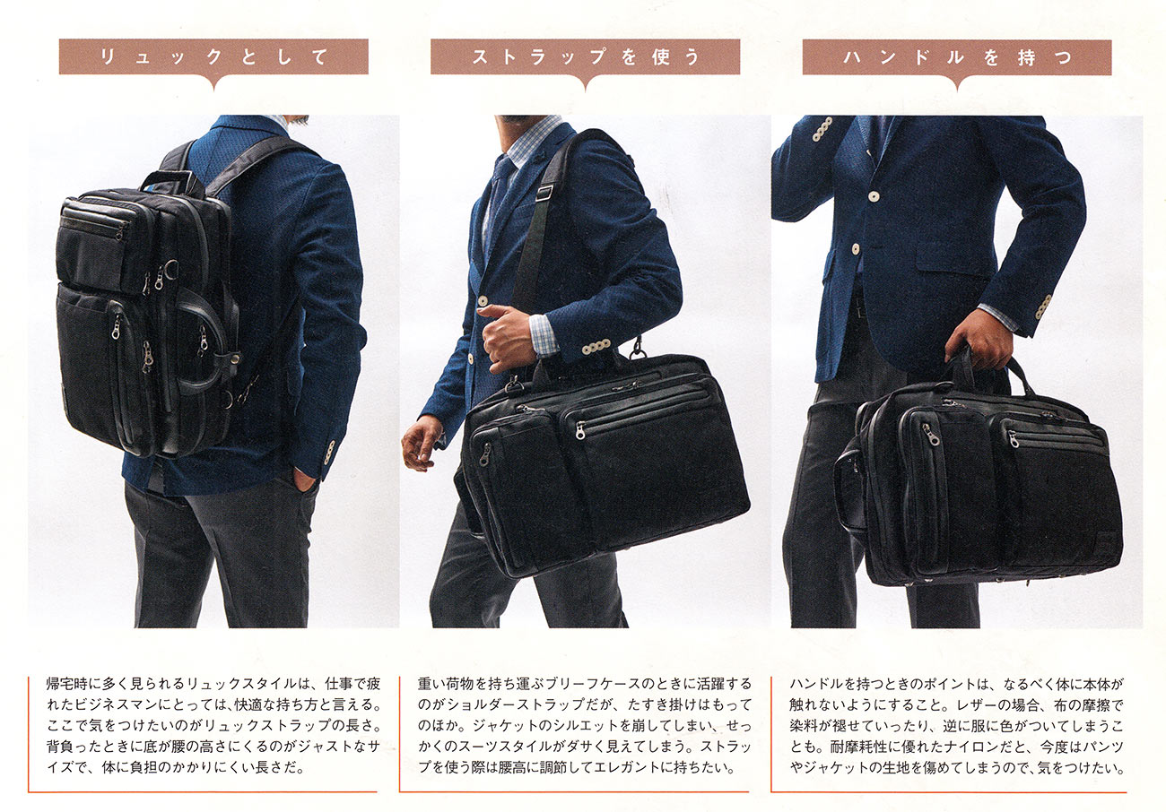 スーツでもジャケットでもカジュアルユースにまでも、どんなスタイルにも合わせていける汎用性の高い3wayビジネスバッグ。