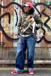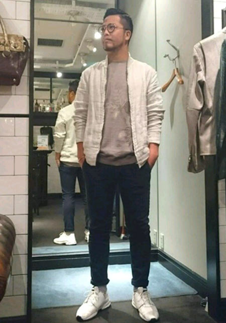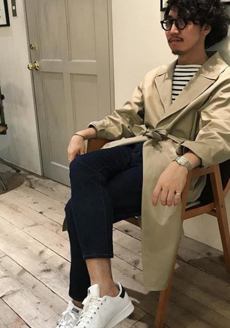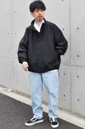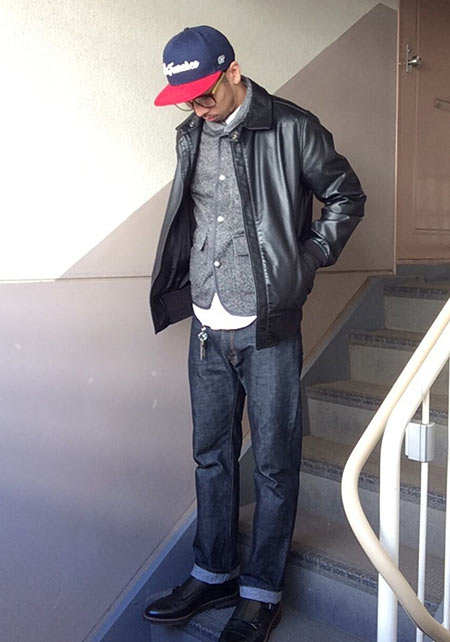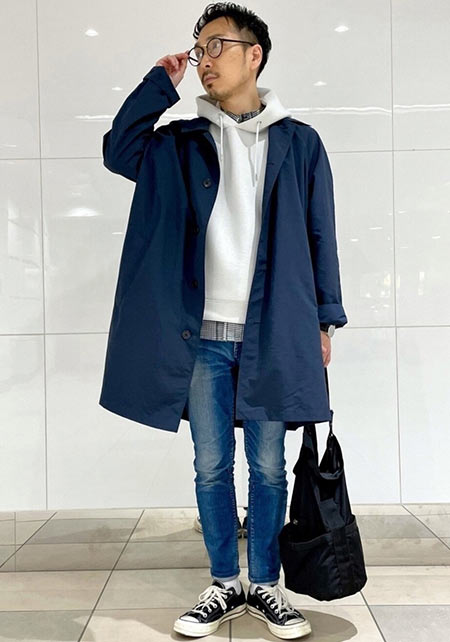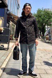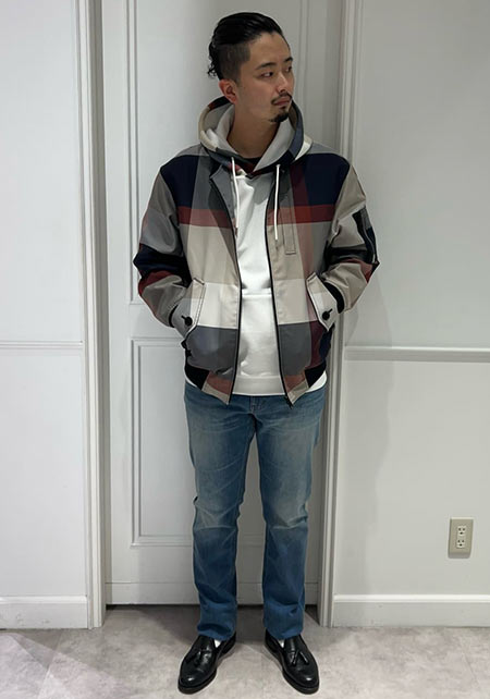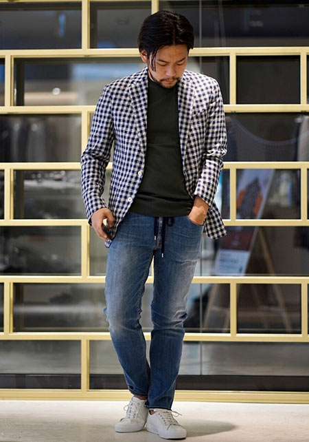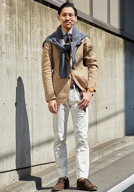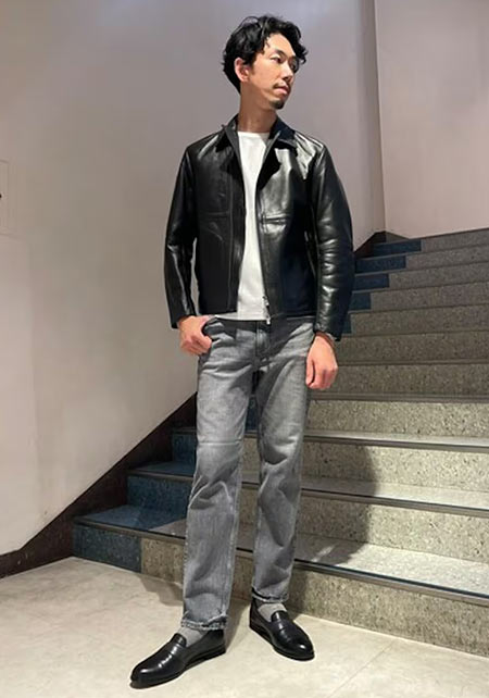 コーティングしたレザーパッチなど、品の良い雰囲気。ホワイトジーンズも人気。