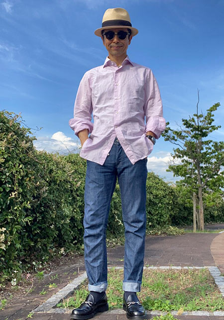 そんな品のよい休日着をイメージして完成したのがこのジーンズ。ロールアップでくるぶしが見えるジャストレングスは、まさにローファーと好相性。