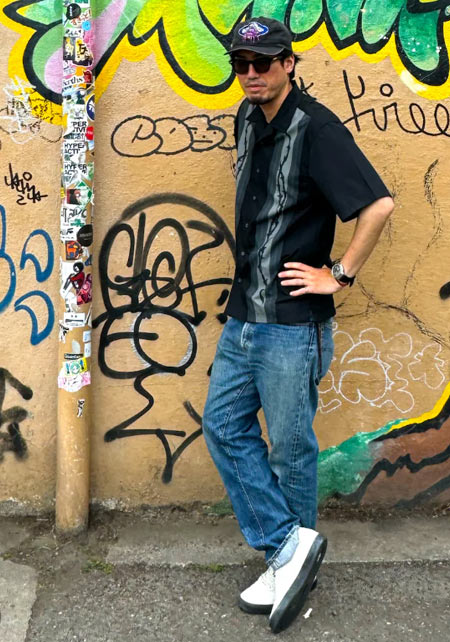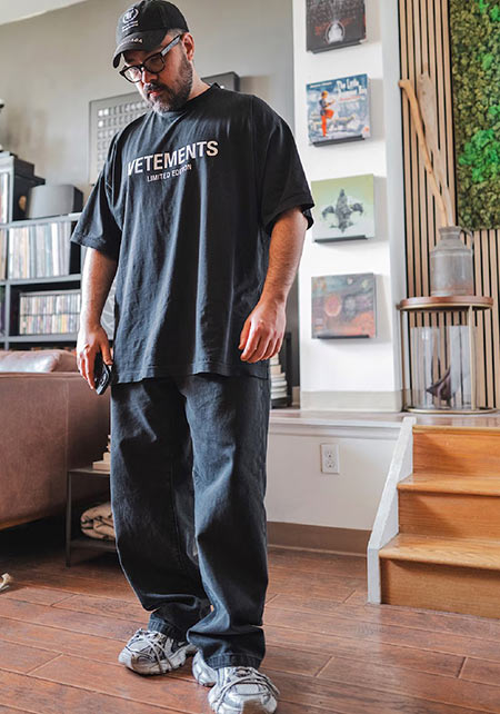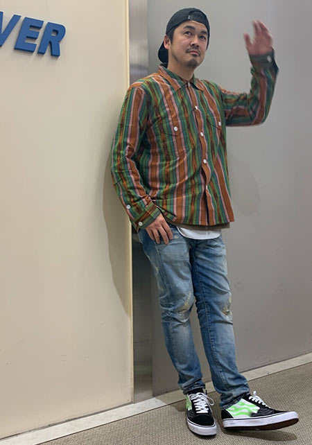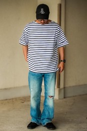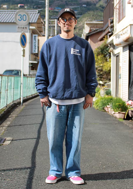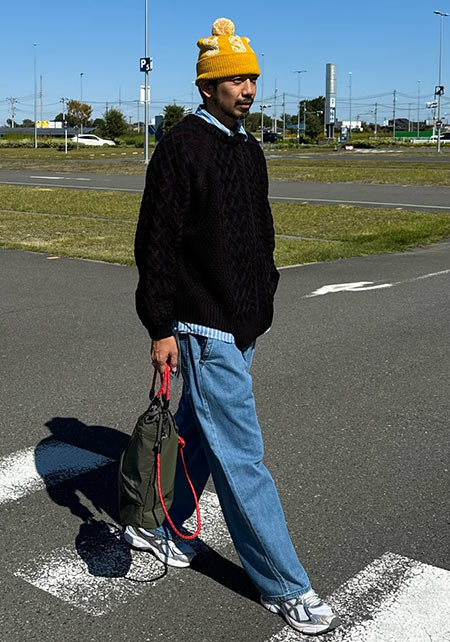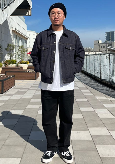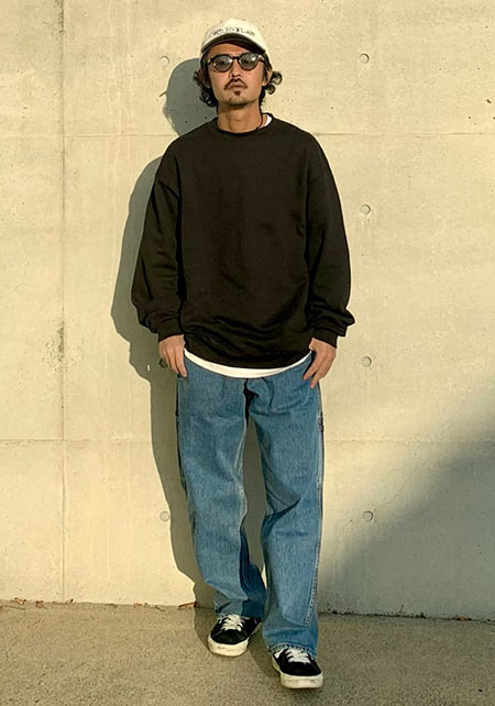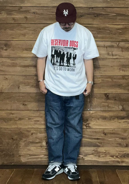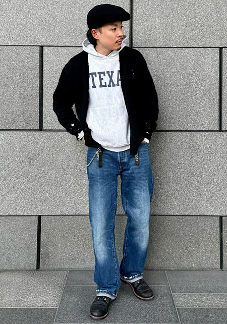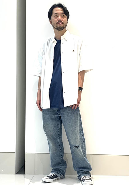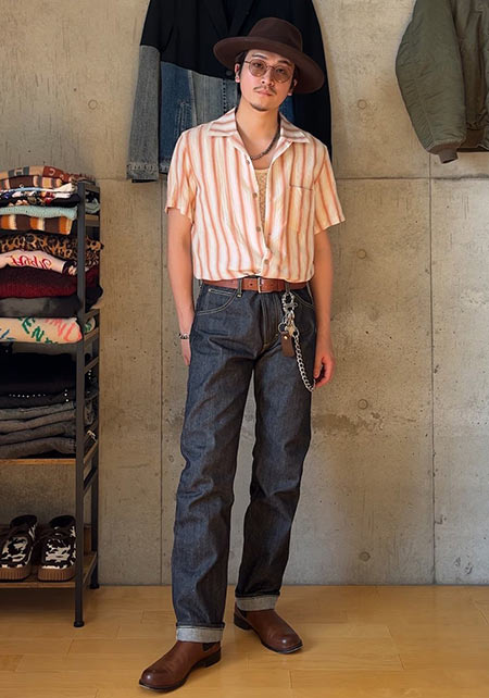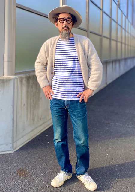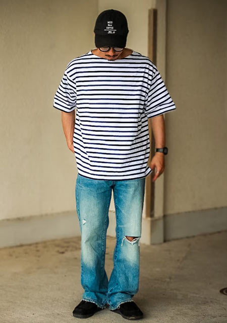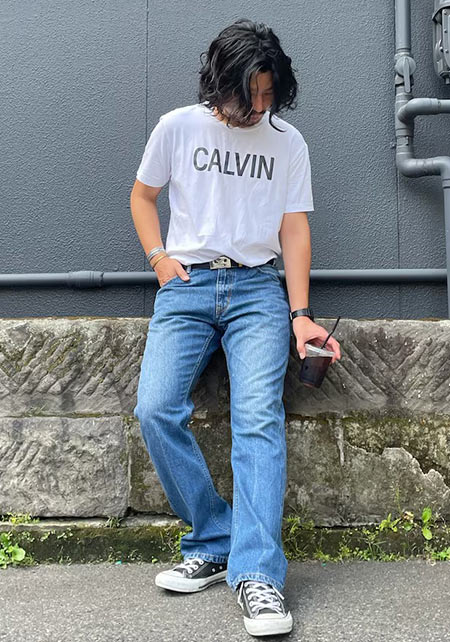 ブランドのアイコンデニムは、腰周りがゆったりしているのでタックインにも打ってつけ。