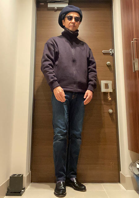 定番のTHE FIVEをベースに、センタープレス、スラントポケットなどスラックス要素を取り入れた。濃紺も相まってジャケットと好相性。
