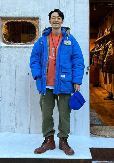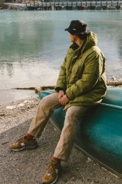 雑誌LEONに掲載されたN-3Bモチーフのダウンジャケット。表面はマイクロキャンバスの上品な光沢、ライニングはリアルダウンを採用。ミリタリーながらリッチな上品顔を実現した大人のミリタリーアウターに。