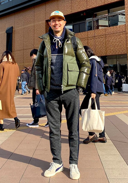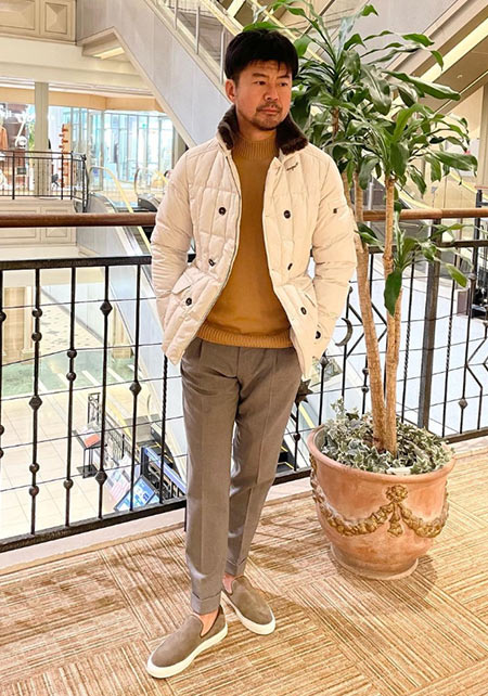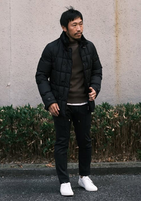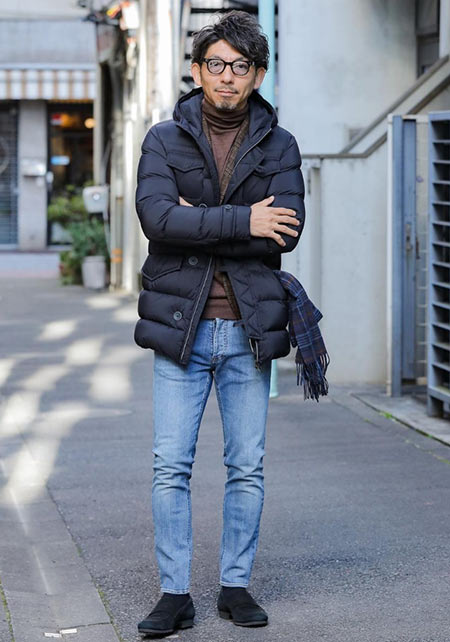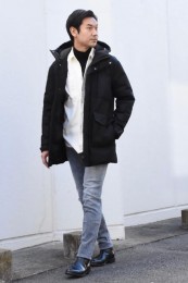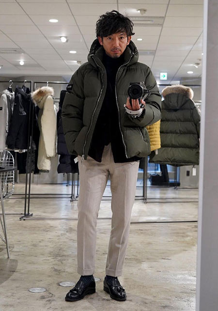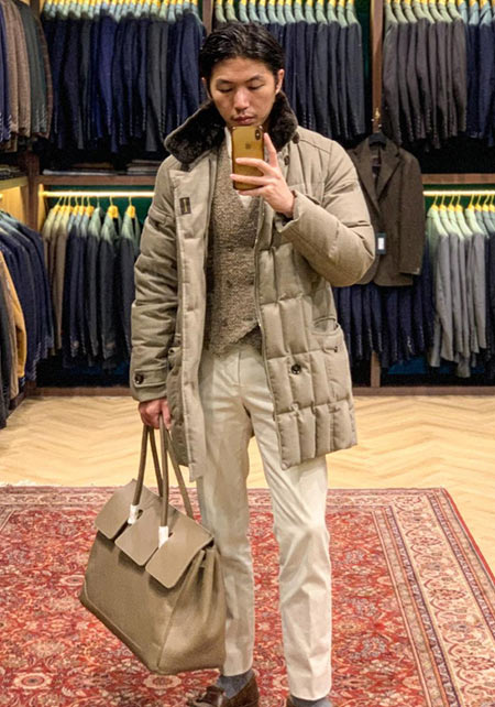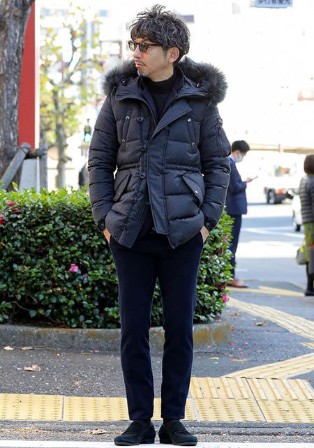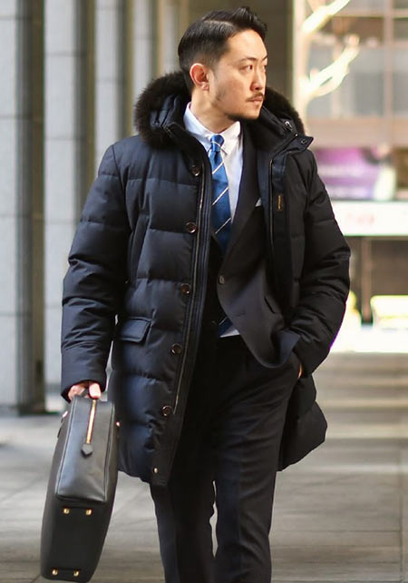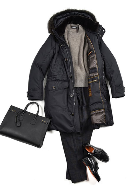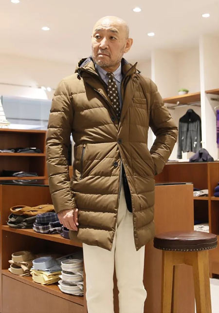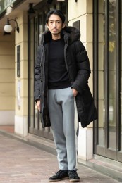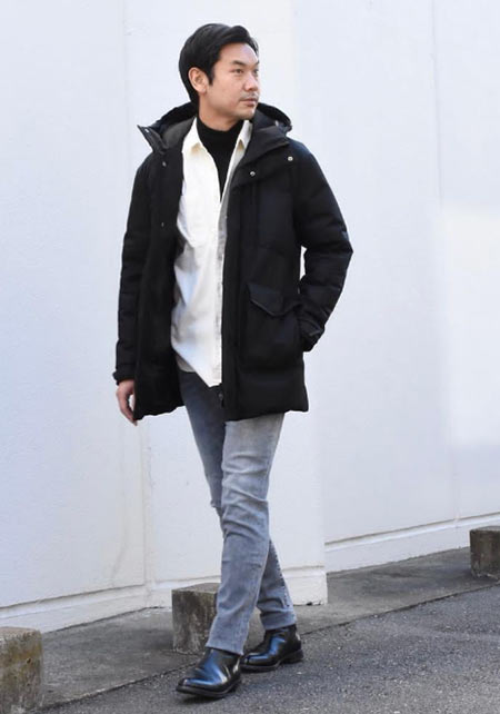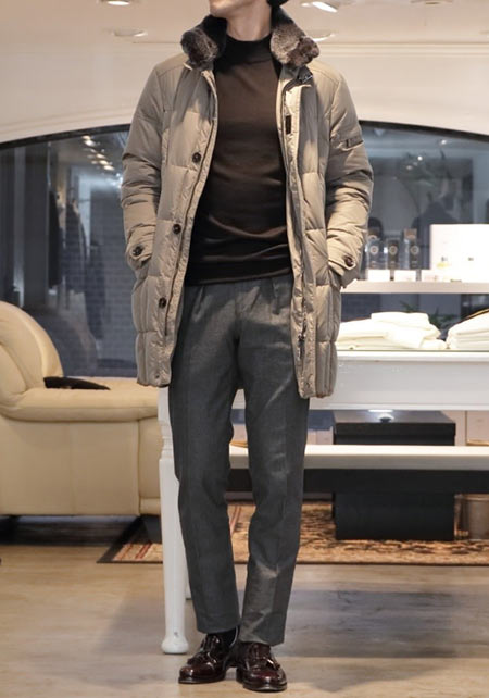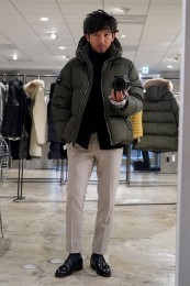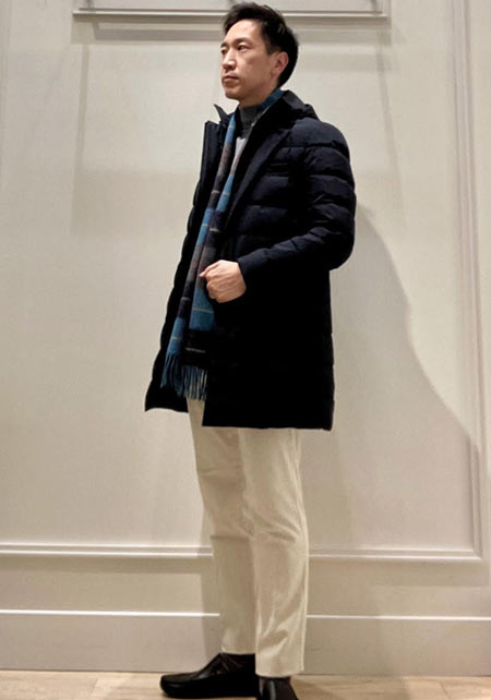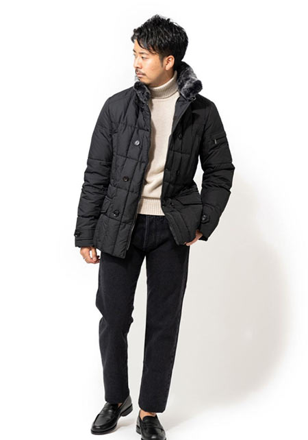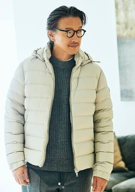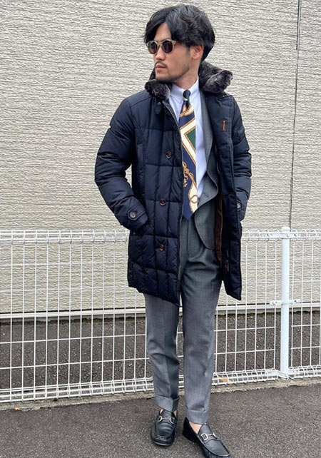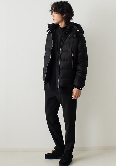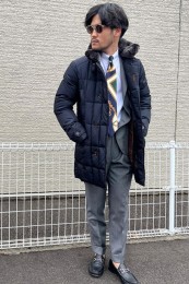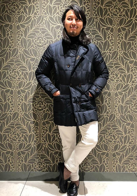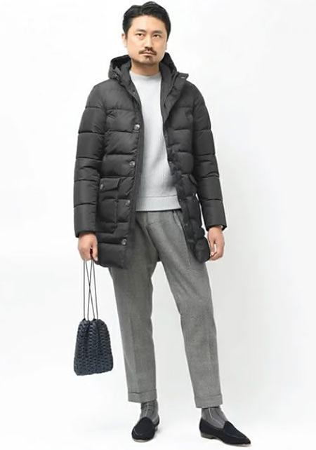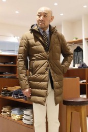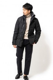 ヒップが隠れるくらいの絶妙な丈感のダウンコートは汎用性が高く、同ブランドでも人気のモデル。オフの日はもちろん、スーツの上に羽織るビジネスアウターとしても活躍。