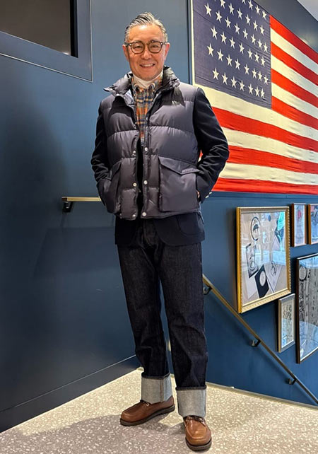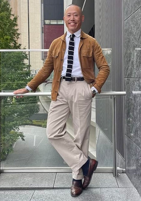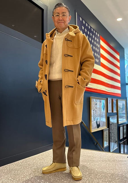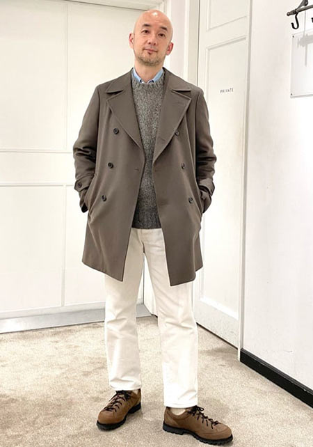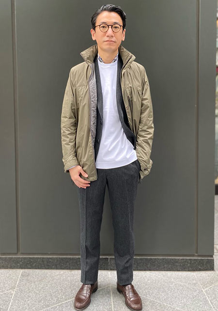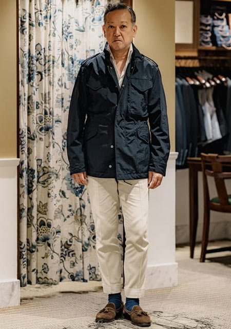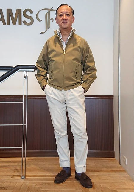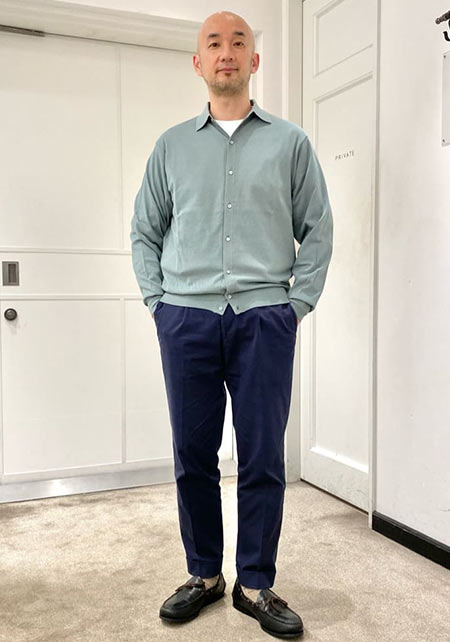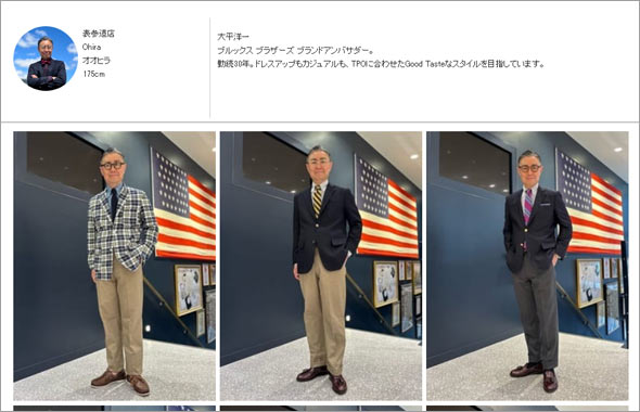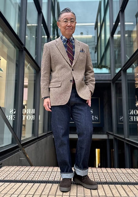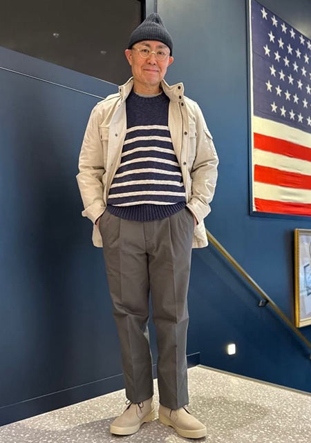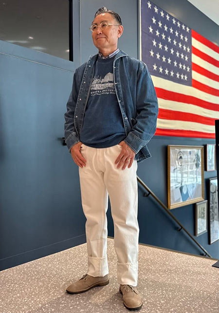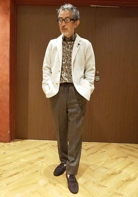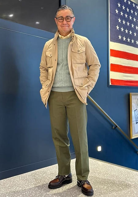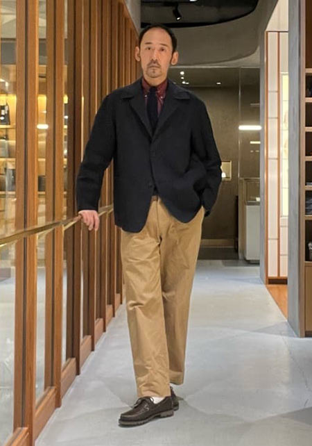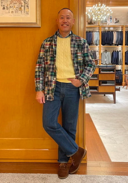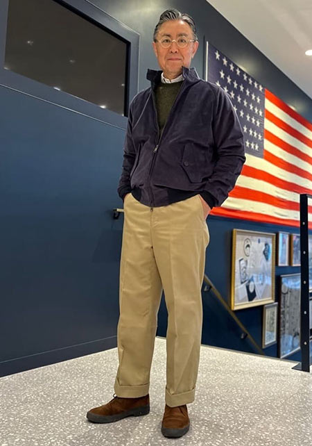 オオヒラさんは同ブランド勤続30年のベテランで、トラッドカジュアルな着こなしを提案しています。