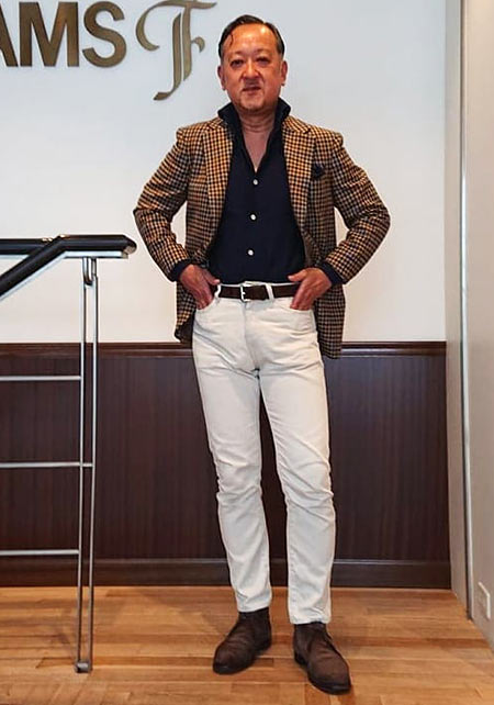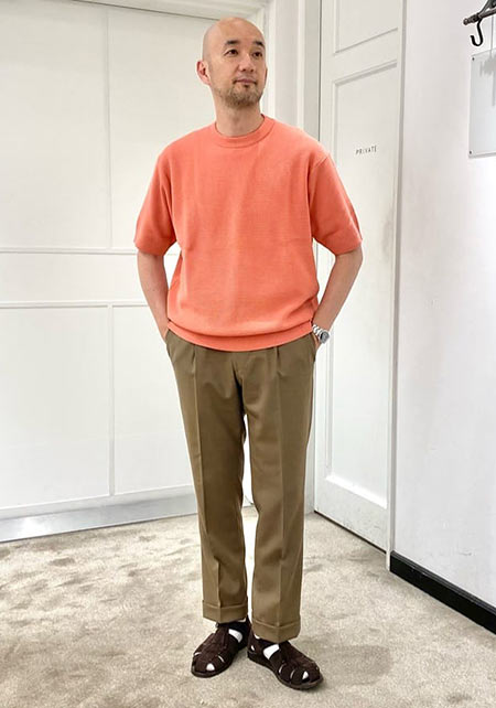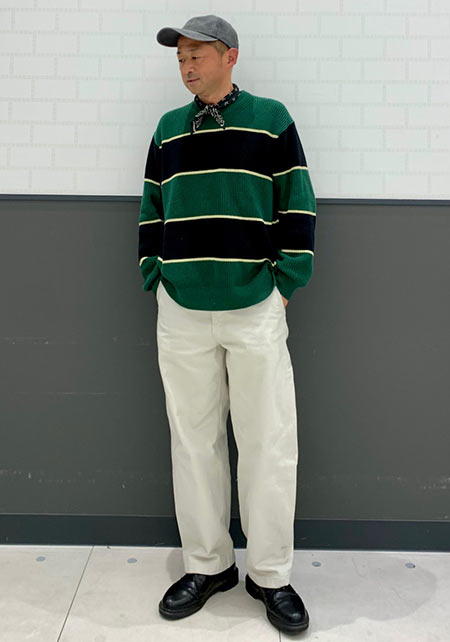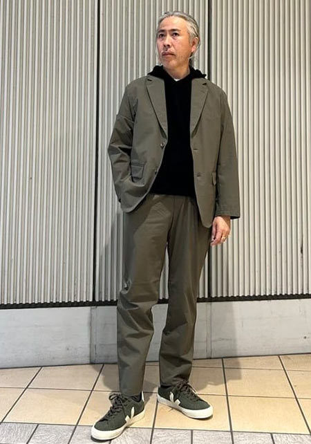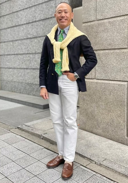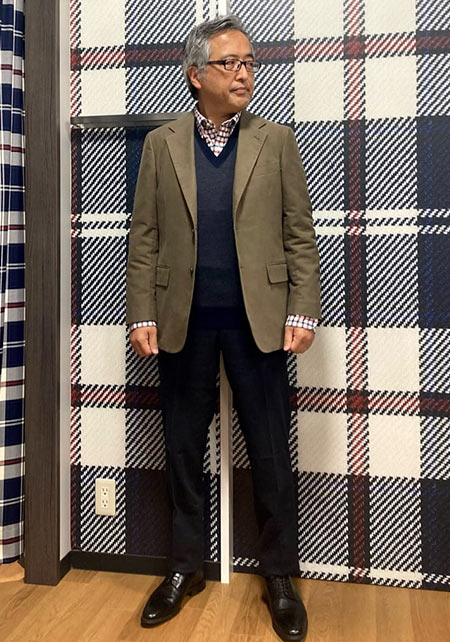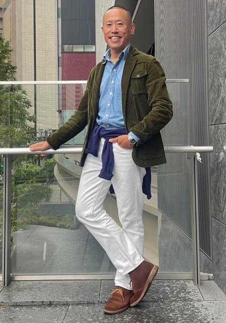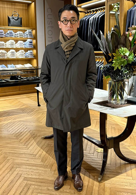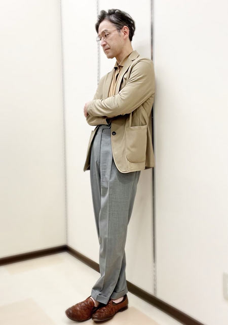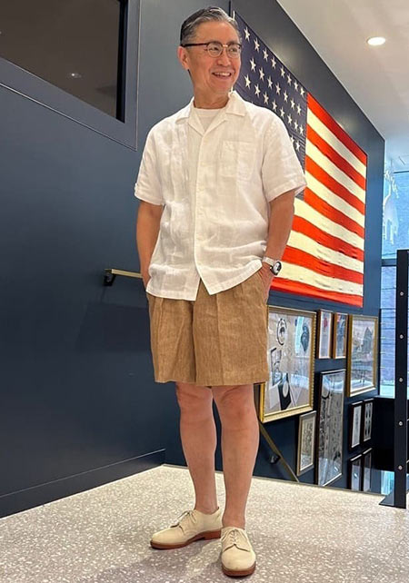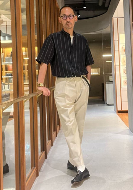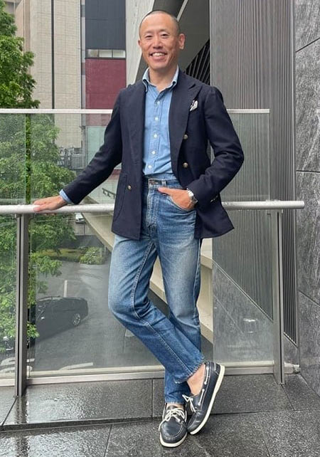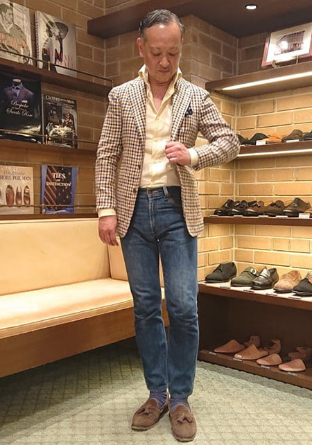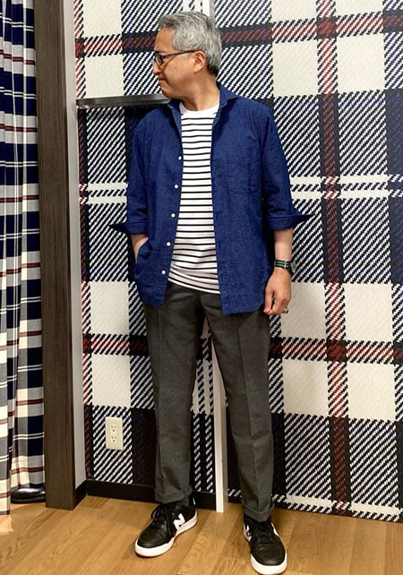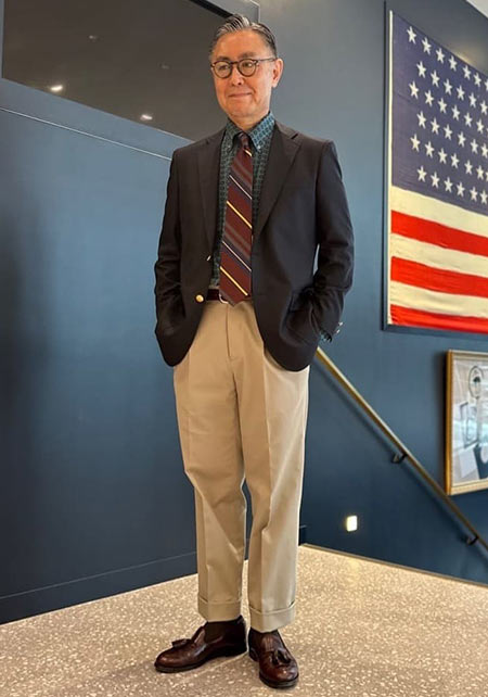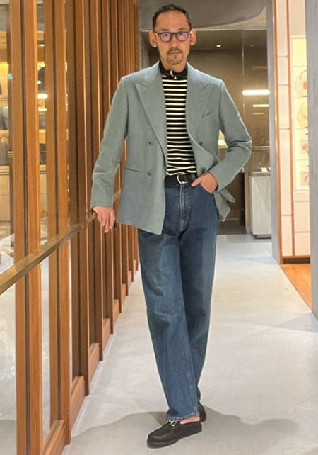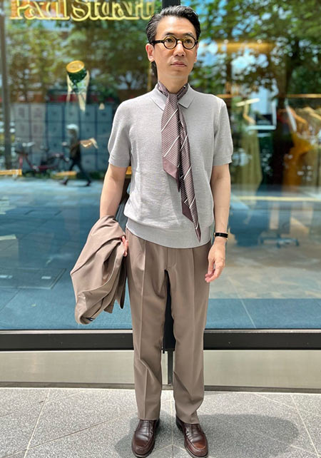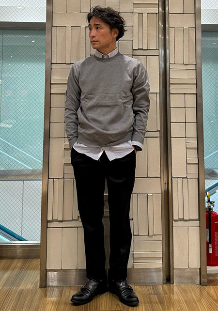 オオヒラさんは同ブランド勤続30年のベテランで、トラッドカジュアルな着こなしを提案しています。