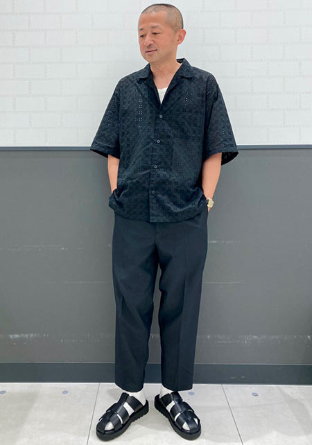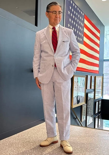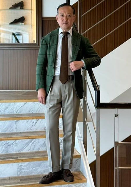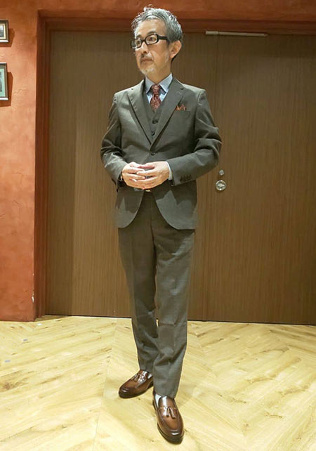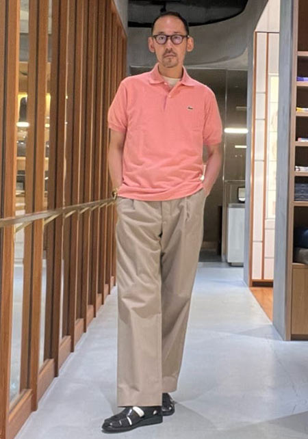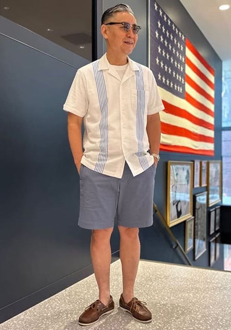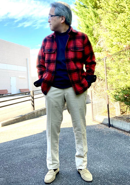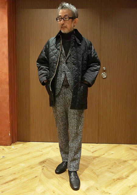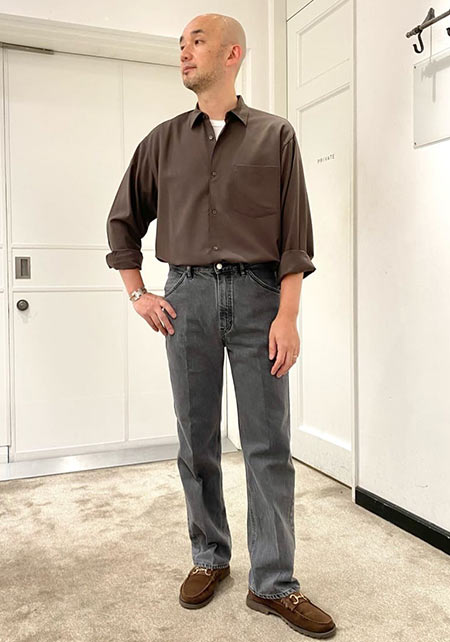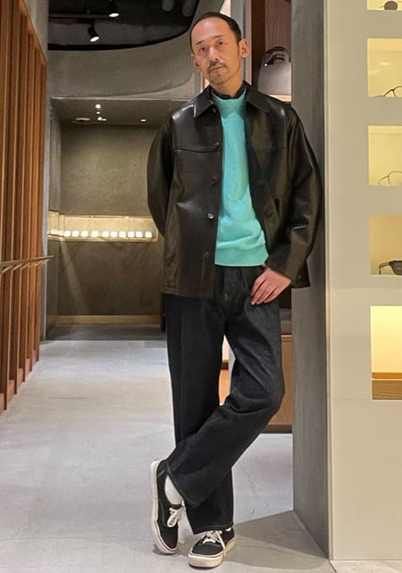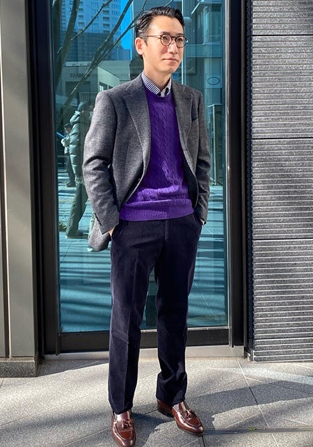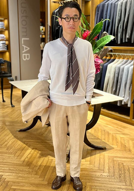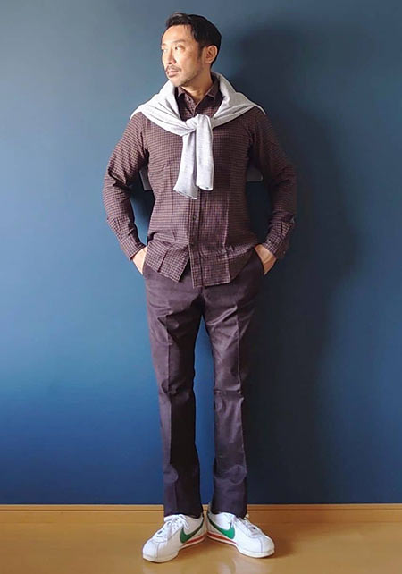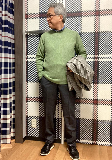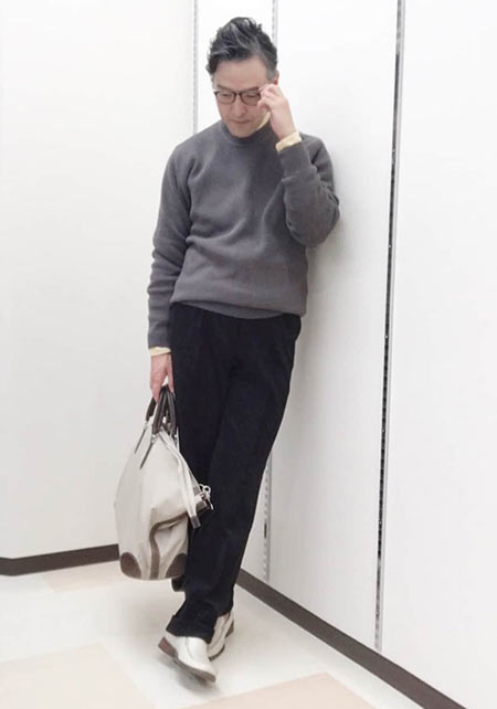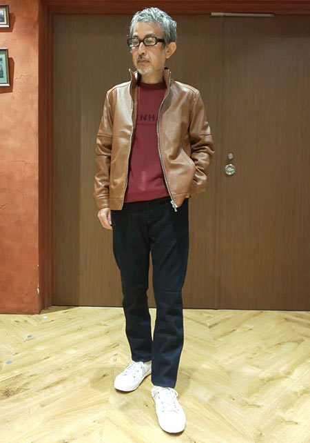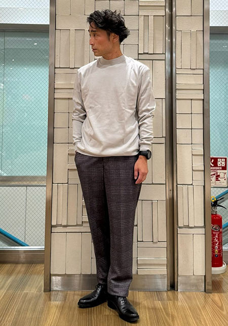 オオヒラさんは同ブランド勤続30年のベテランで、トラッドカジュアルな着こなしを提案しています。